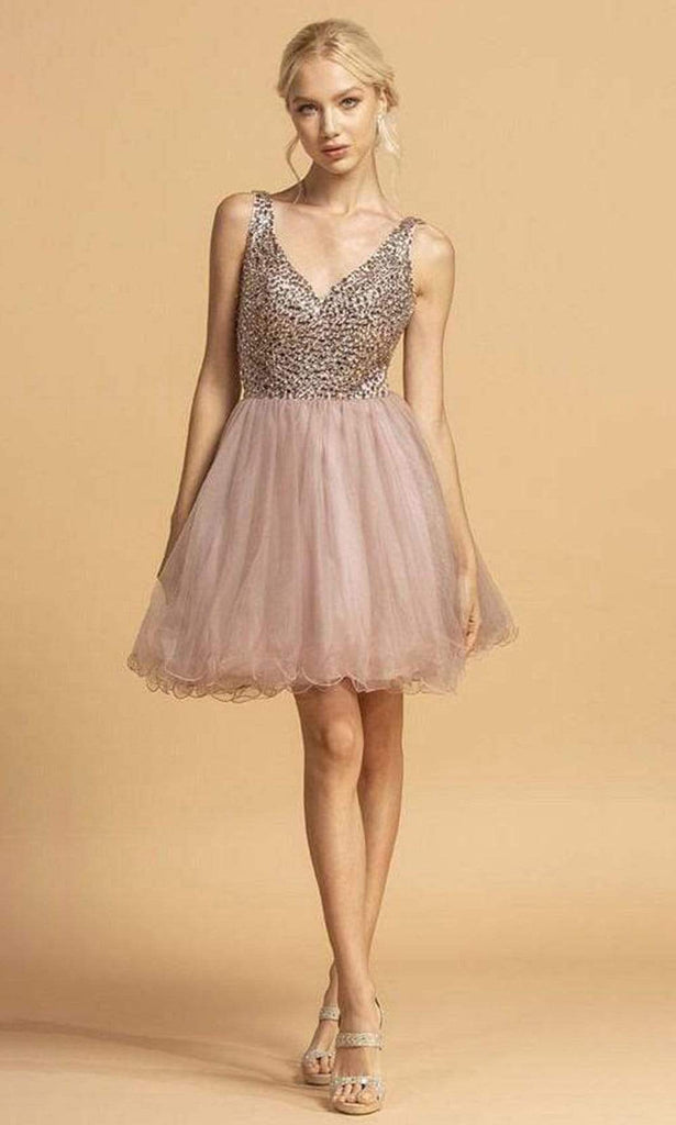 Expect to be turning heads as you walk by in this Aspeed Design S2114 creation. Flatteringly glinting with crystal-embellished bodice, this sleeveless dress charms with a v-neckline with a low scoop back. The tulle skirt flares into a short curled hem. Look like perfection in this beautiful Aspeed Design masterpiece. Models are wearing the Mauve, and Slate Blue colors.