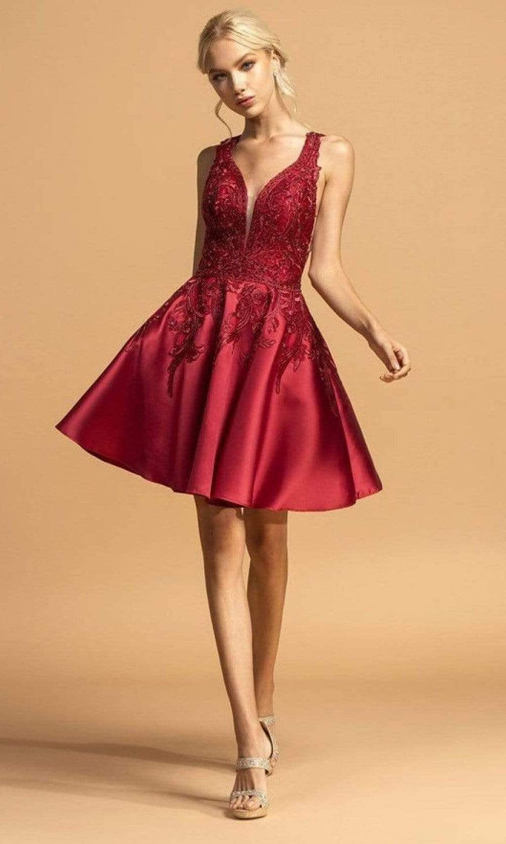 | Details: | Satin, Sleeveless, Illusion Inset, Embroidered, Rhinestones, Deep V-Open Back, Zipper Closure, Short Hem, Applique |