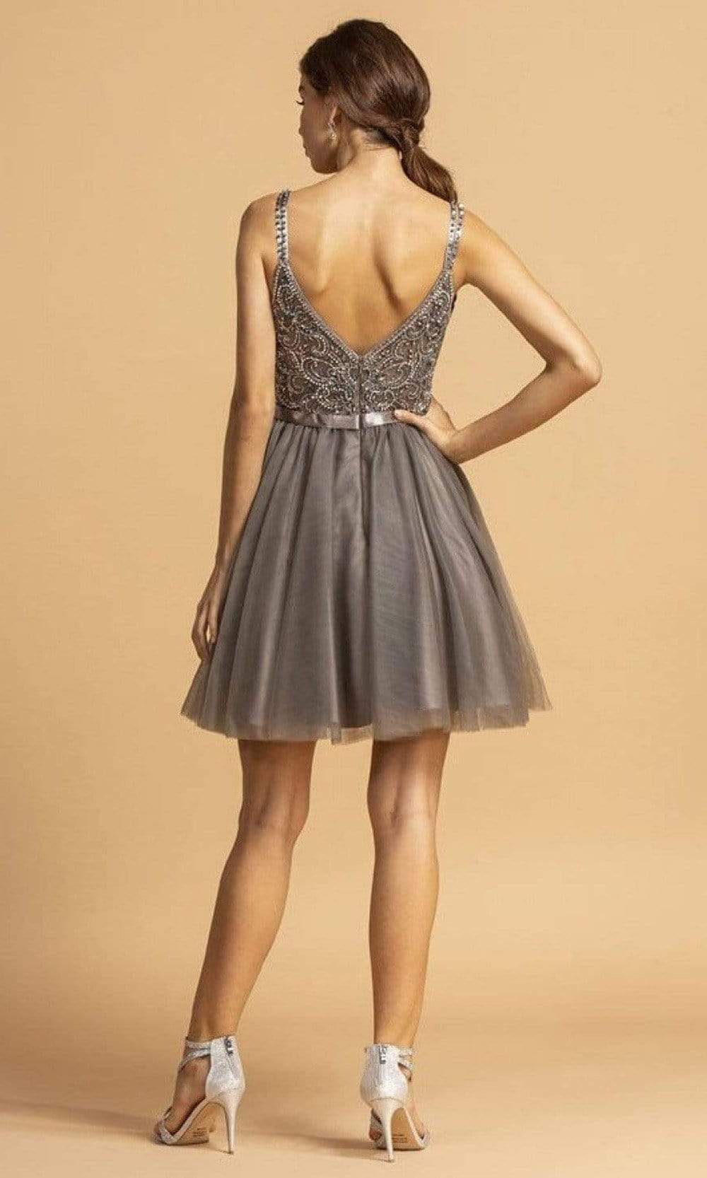 COCKEvery detail of this Aspeed Design S2120 is dripping with faultless charm! Fit and flare dress with a tulle skirt in short length. It feature4s a sleeveless V neckline matched with a V cut open back. It is embellished with beads on a fitted bodice. This Aspeed Design is the perfect match for the girl who wants to look both sexy and fashion-forward. Model is wearing Charcoal color.