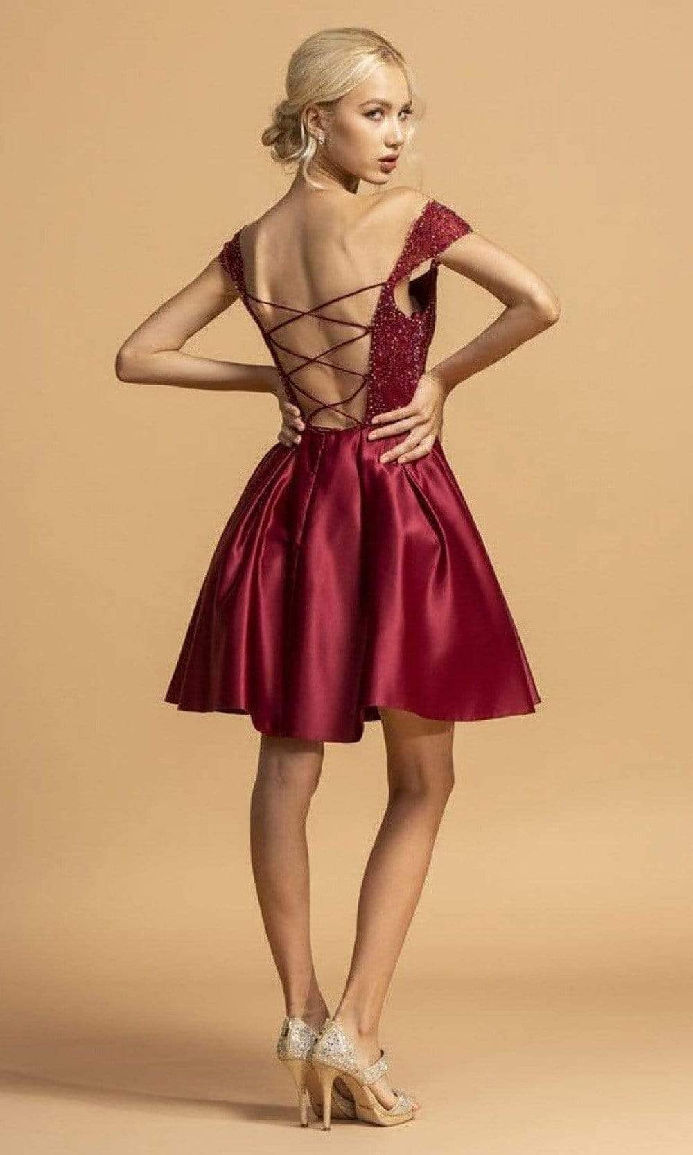 Look jaw dropping in this Aspeed Design S2262 cocktail dress. This dress showcases a modified square neckline supported by cap sleeves in a beaded bodice. Revealing an A-Line silhouette, this also displays a mid-open back with lace up back and back zipper closure. Wow everyone in this sophisticated Aspeed Design creation. Model is wearing Burgundy color.