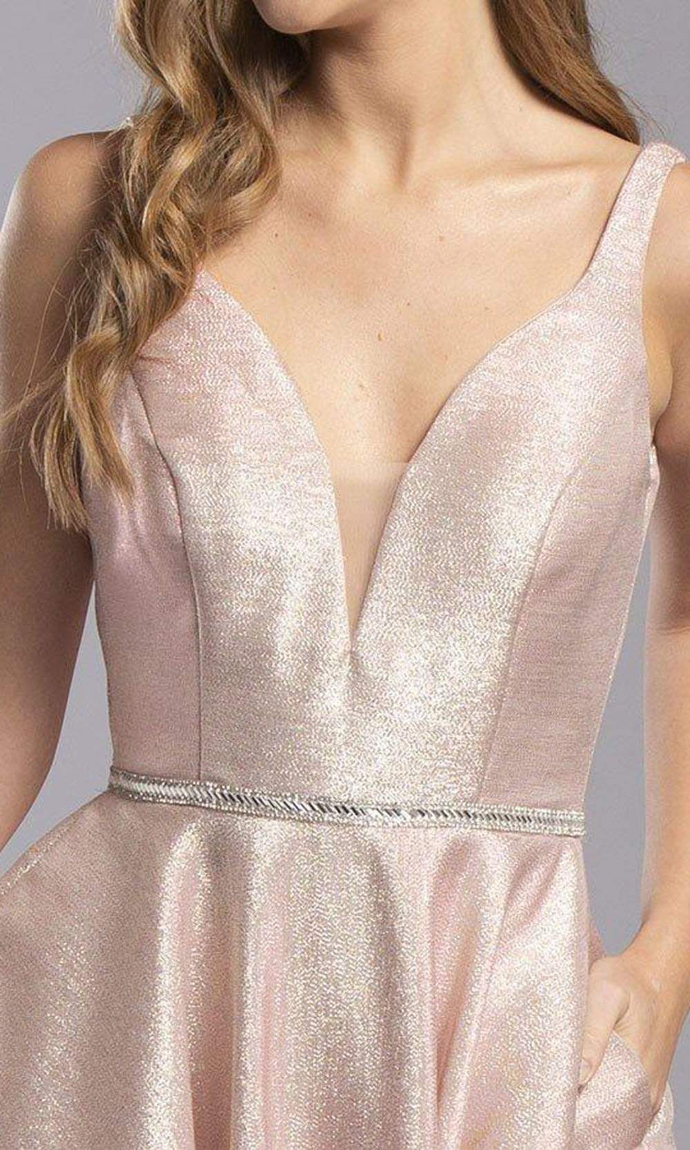 | Details: | Glitter Crepe, Metallic, Illusion Inset, Low V-Open Back, Beaded Waist, Pockets, V-Open Back, Zipper Closure, Short Hem |