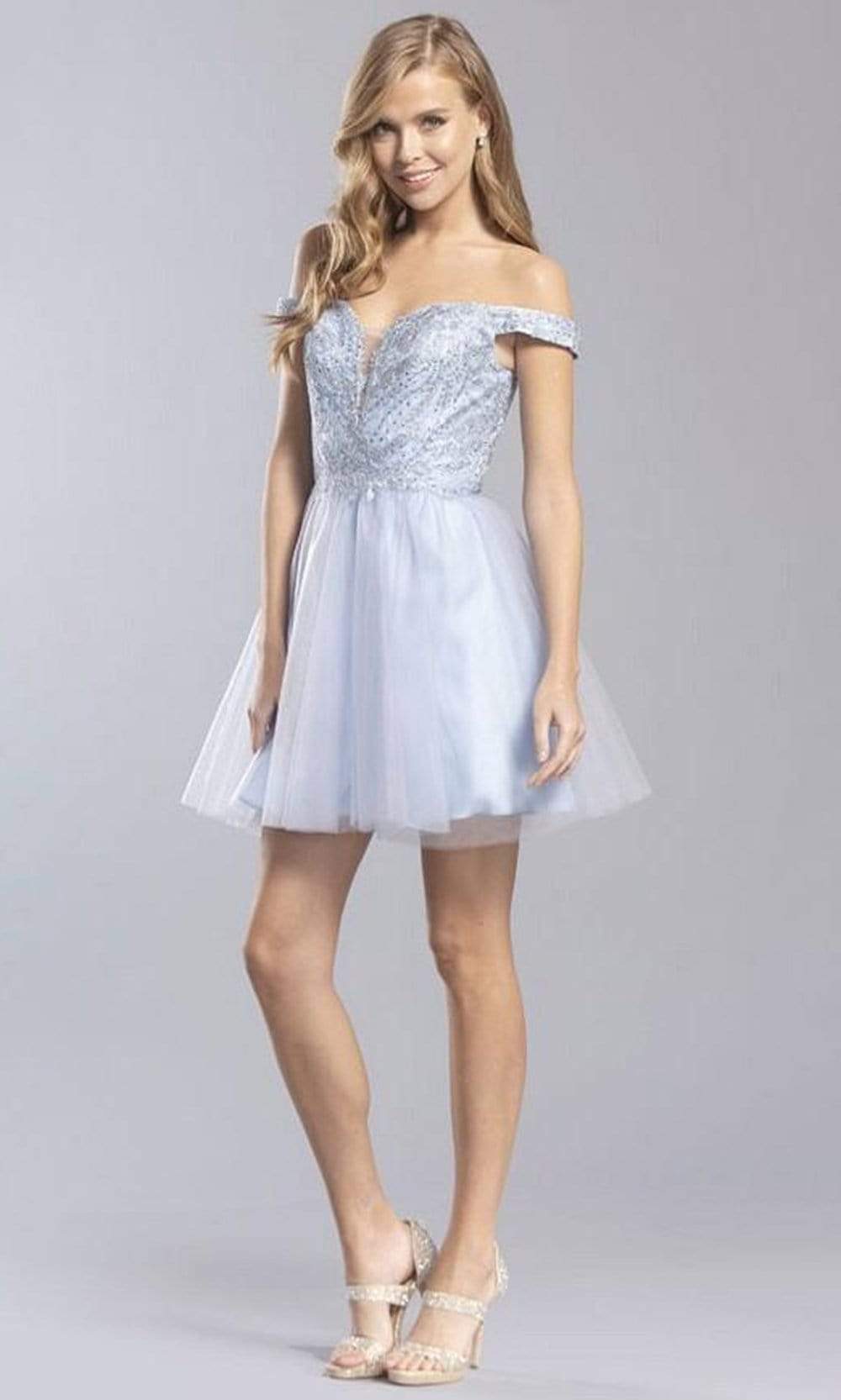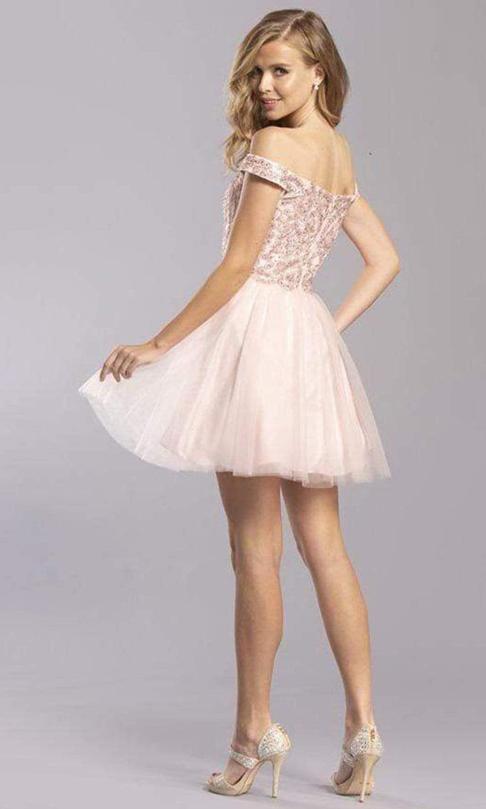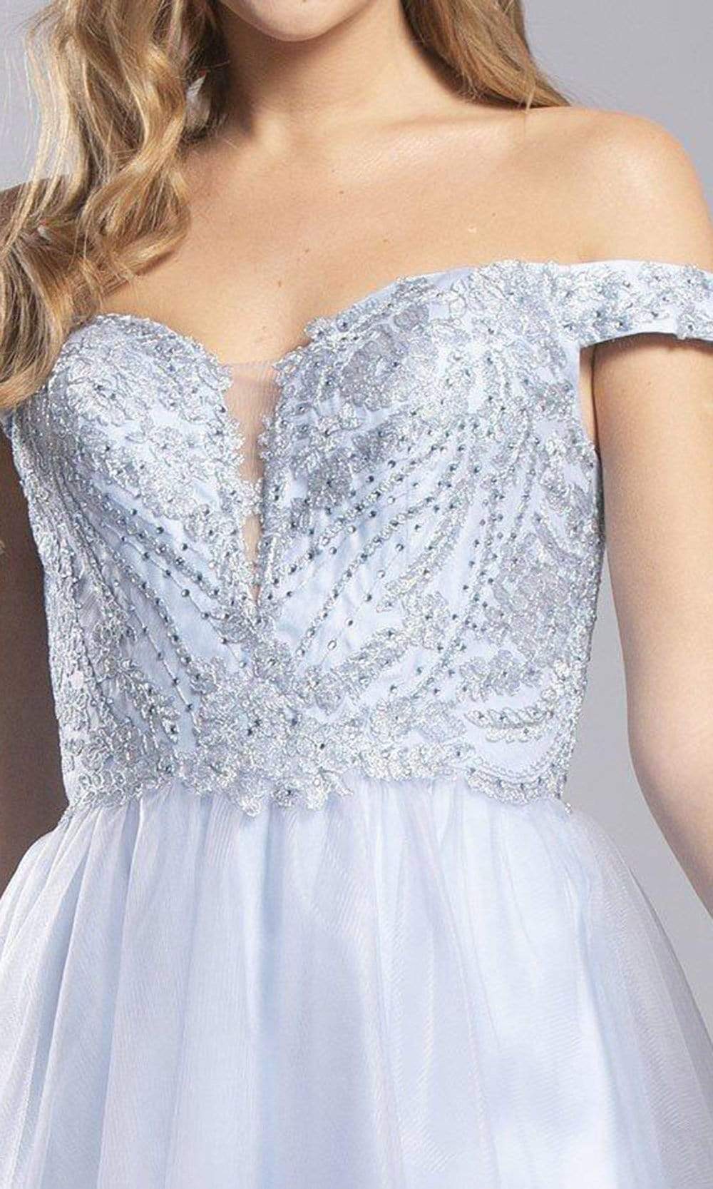 Lavish in the pure romance of this Aspeed Design S2323 creation. Styled with bead and applique embellished bodice, this off shoulder dress reveals an illusion inset and a midrise back. The tulle overlaid skirt sways into a short hemline. Be crowned as the belle of the ball in this Aspeed Design masterpiece. Models are wearing the Blush, Off White and Pewter colors.