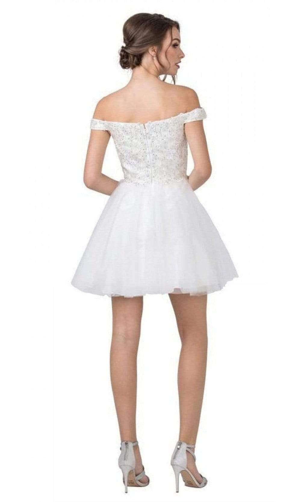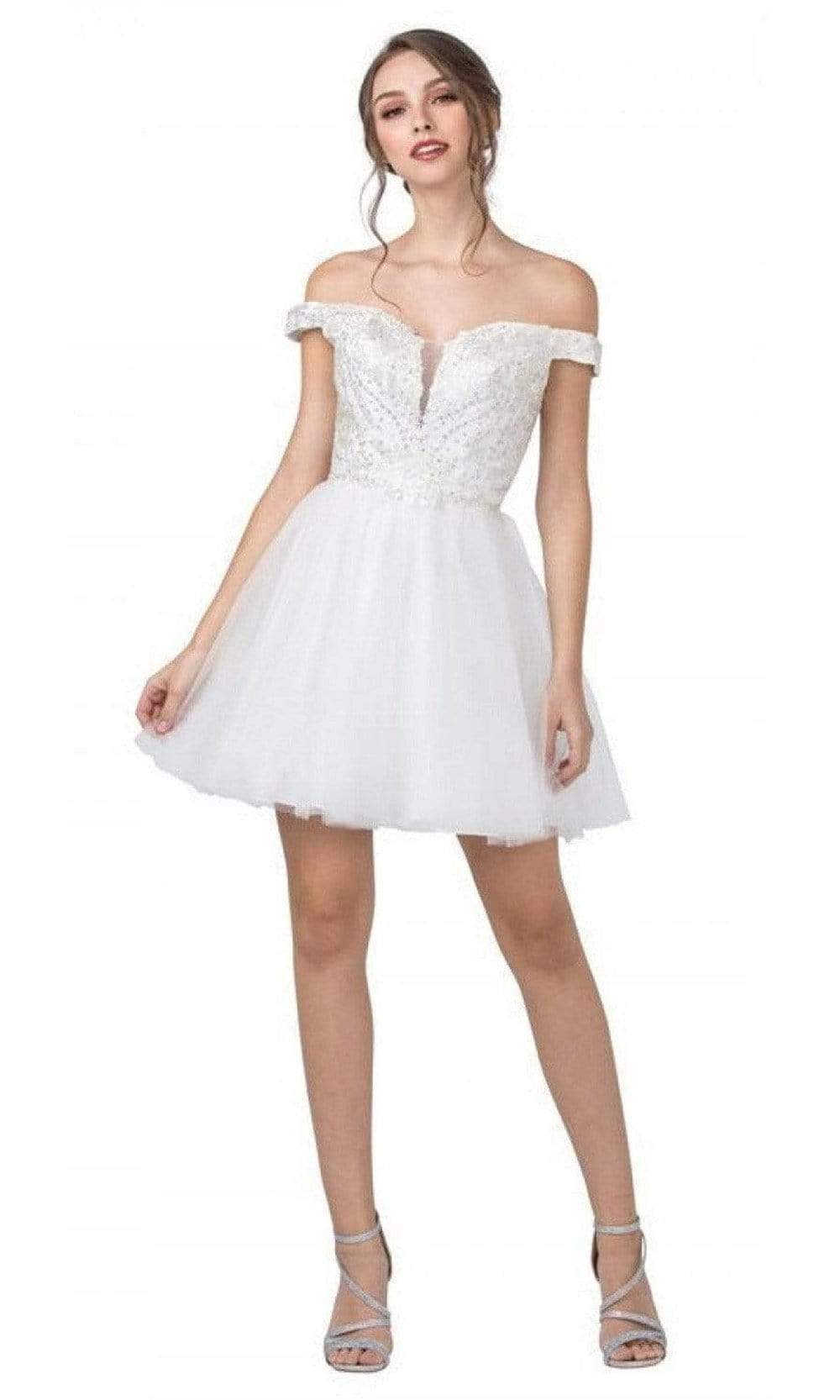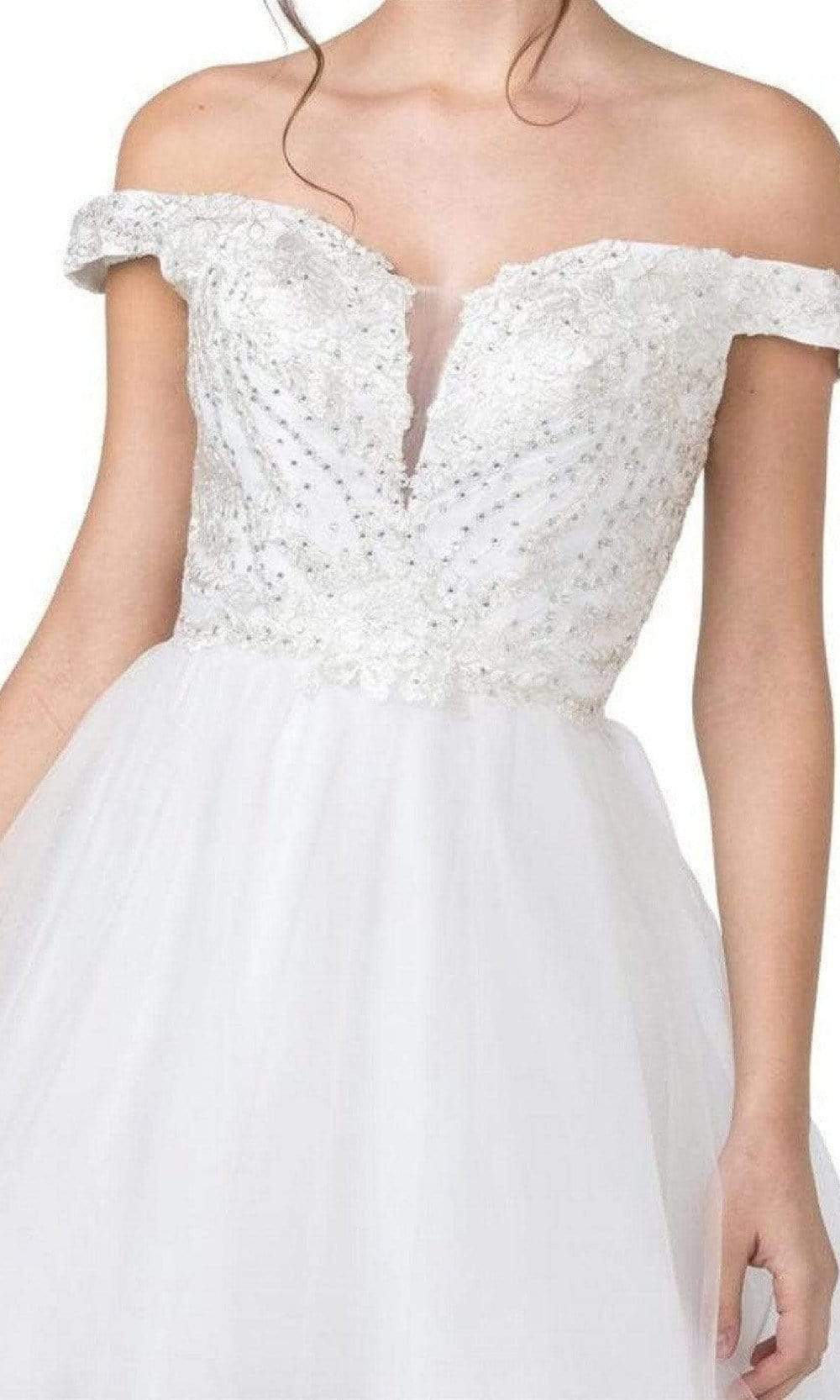 Lavish in the pure romance of this Aspeed Design S2323 creation. Styled with bead and applique embellished bodice, this off shoulder dress reveals an illusion inset and a midrise back. The tulle overlaid skirt sways into a short hemline. Be crowned as the belle of the ball in this Aspeed Design masterpiece. Models are wearing the Blush, Off White and Pewter colors.