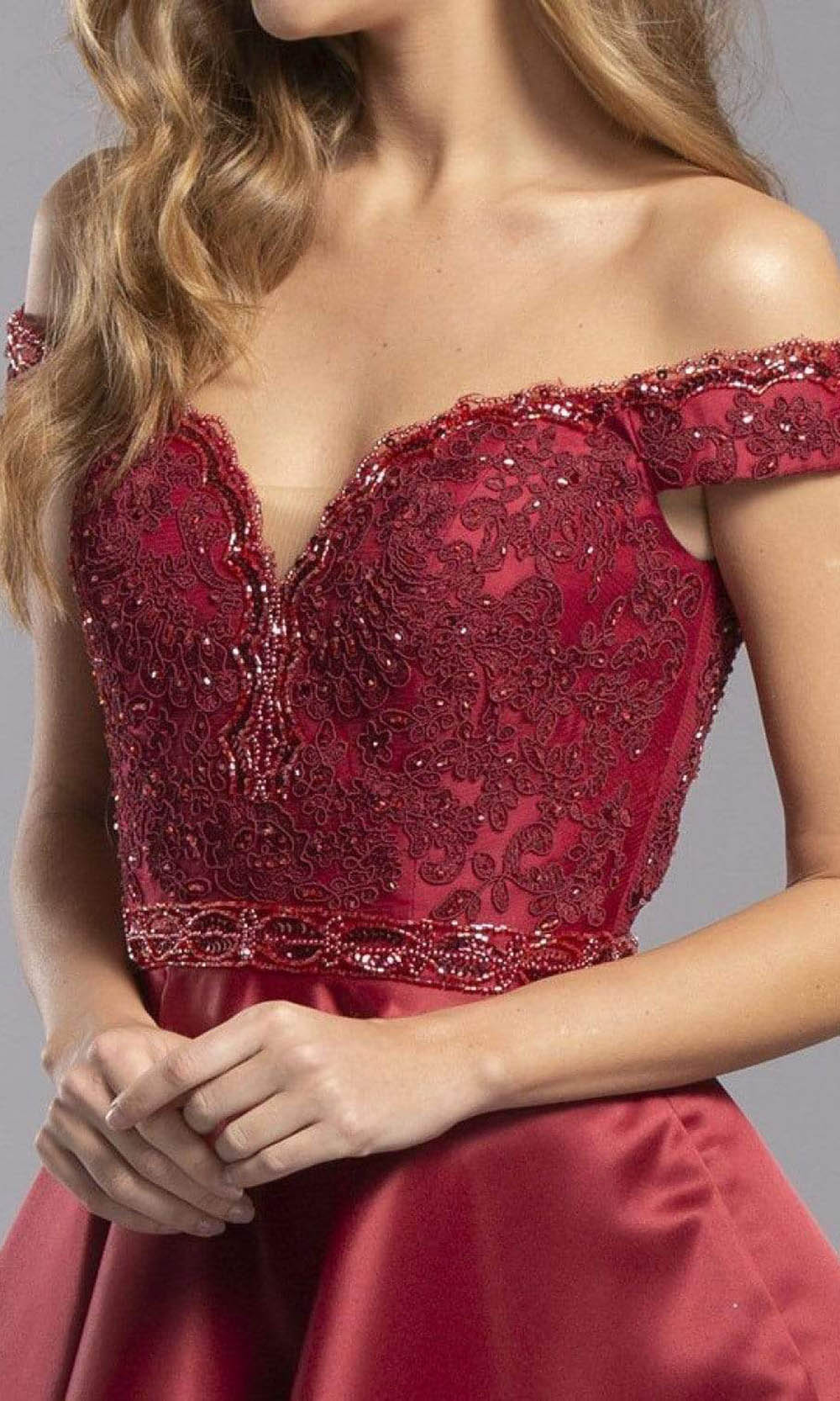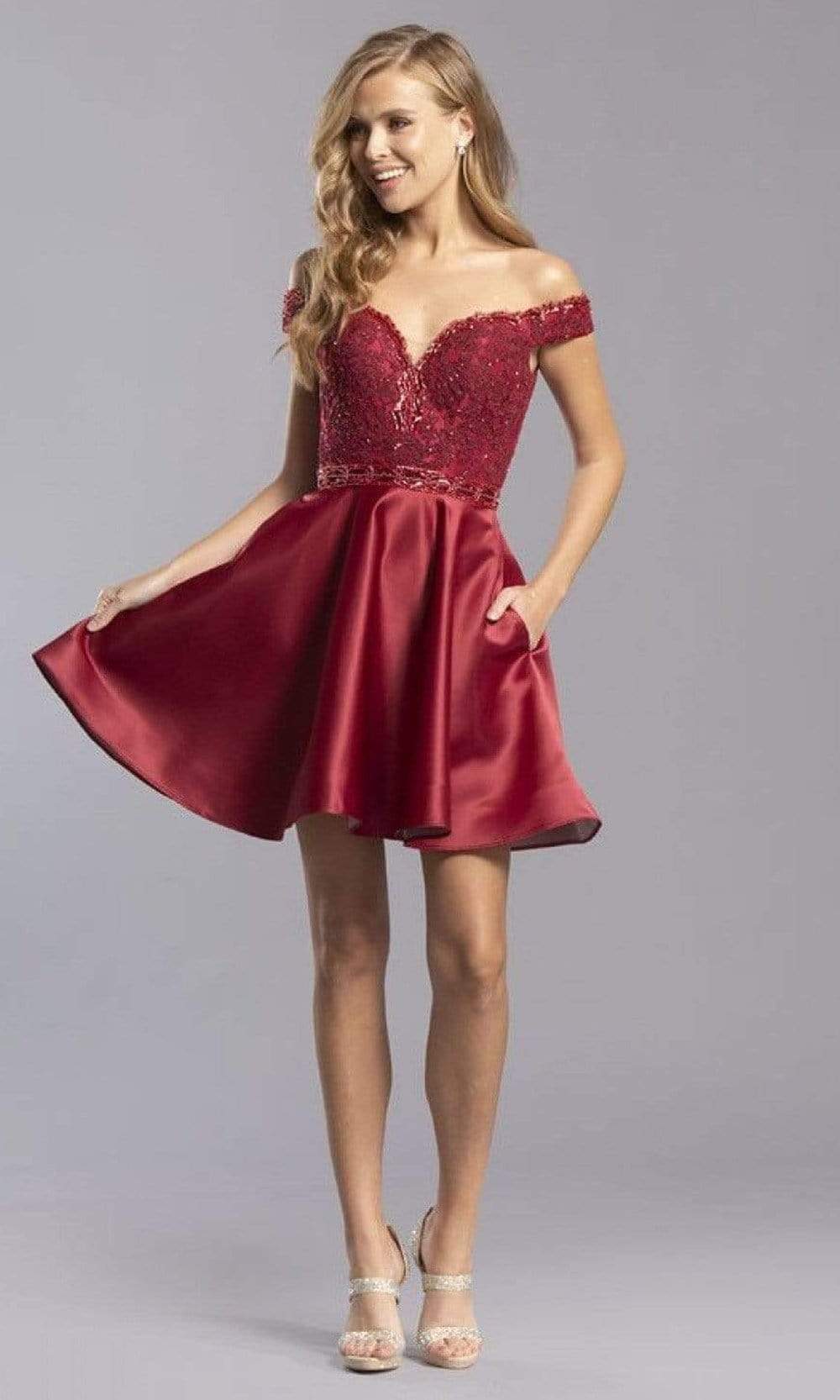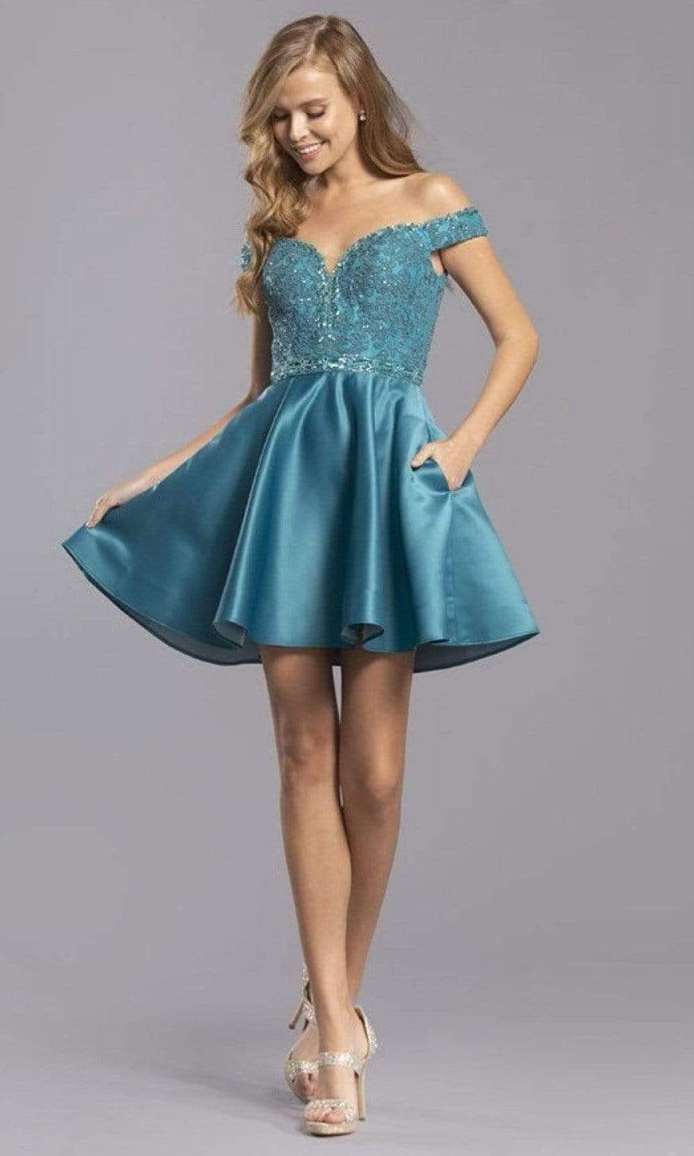 Details: Off shoulder sleeves, Pockets, Satin, Lace, Beads, Back zipper