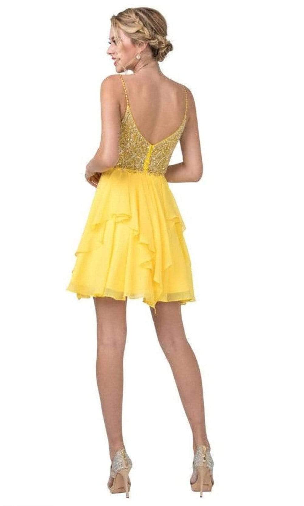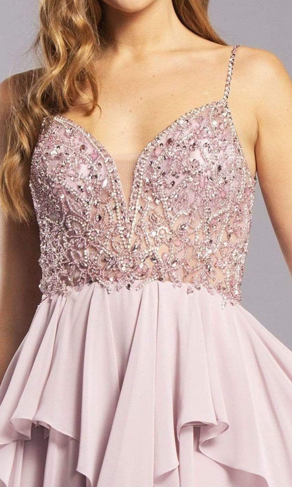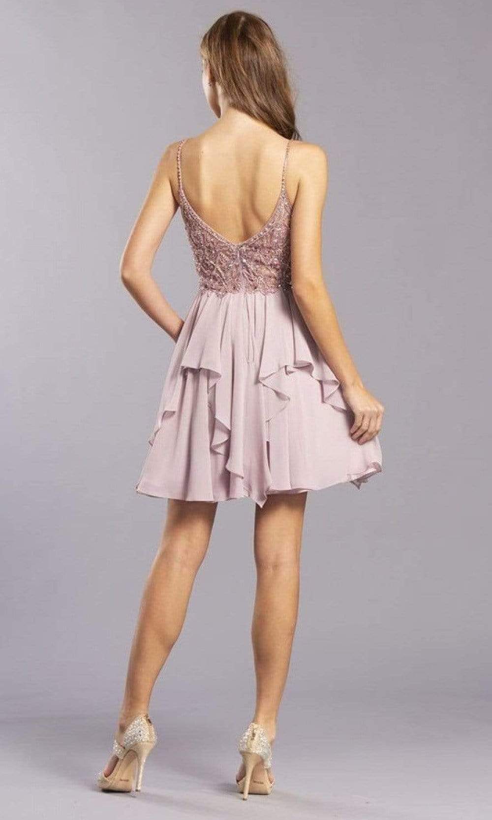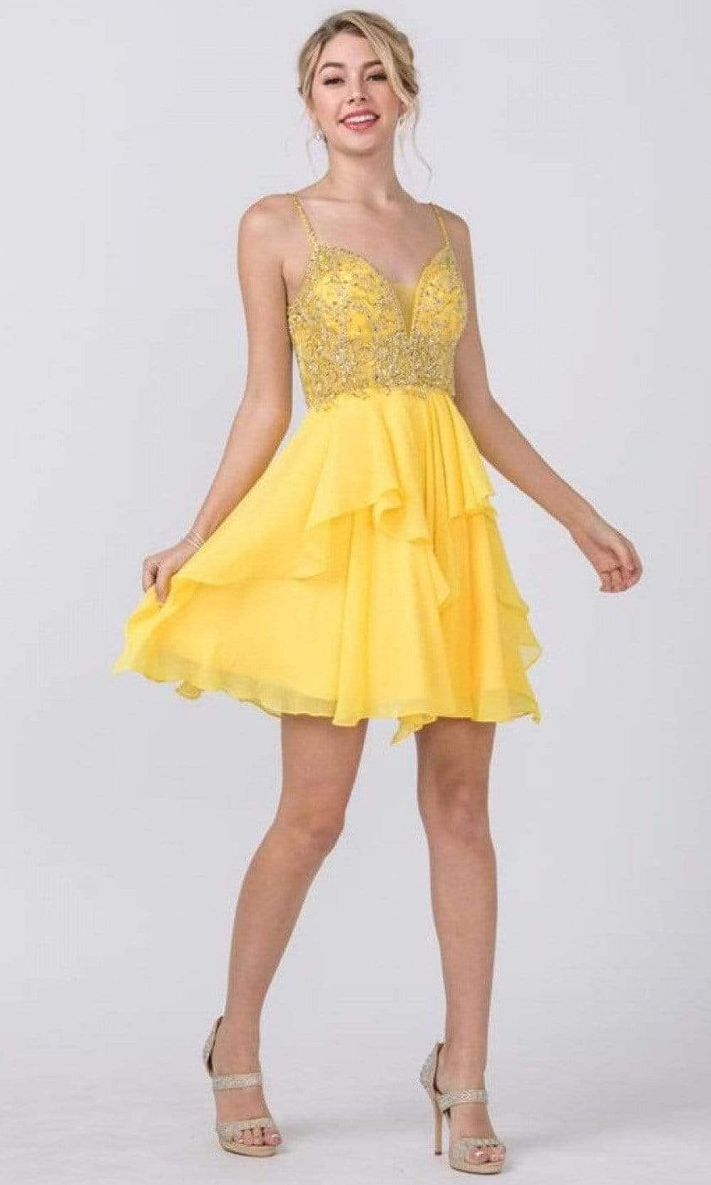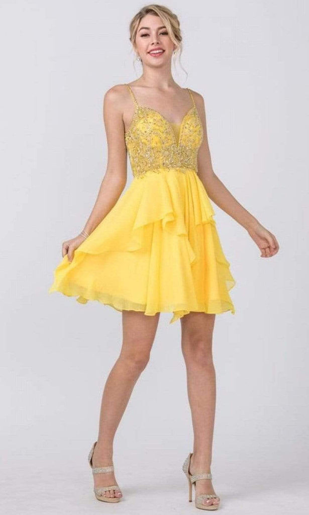Every detail of this Aspeed Design S2334 is dripping with faultless charm!. This amazing cocktail dress features a spaghetti straps and plunging neckline with sheer panel. The top of the dress has a very beautiful bead embellishment. The skirt has a ruffles designed that adds up to the elegance of the dress. The scoop back is for a sexy and seductive look. It has a back zipper for closure. Aspeed Design creation is perfect for a girl who wants the standout style and flawless fit.