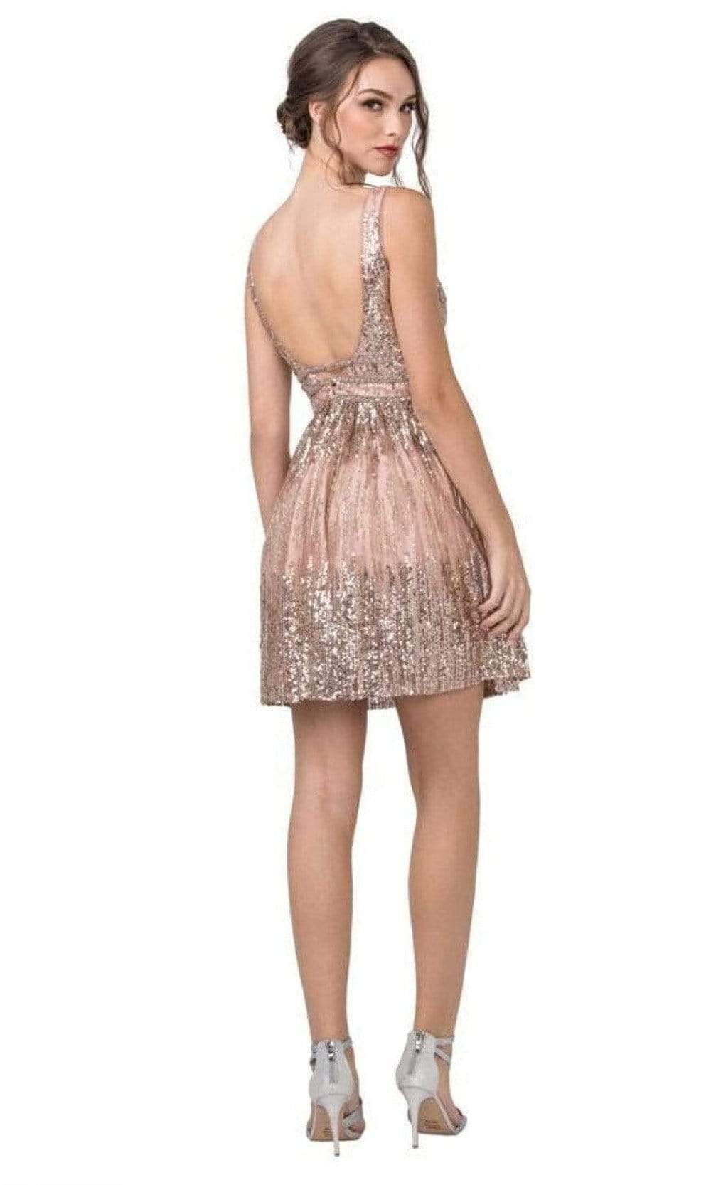 Appear like a modern princess with the unique sequins design with this Aspeed Design S2344. A shimmering cocktail dress that parades a plunging neckline with sheer panel an a sleeveless. This dress is design with a beautiful shining sequins throughout and shimmering glitters on the skirt. It has three bands that are made with sequins. It is an A-line silhouette cocktail dress that has a flowy and wavy skirt and a scoop back to show some skin for a sexy and alluring look. This Aspeed Design creation is simply captivating!