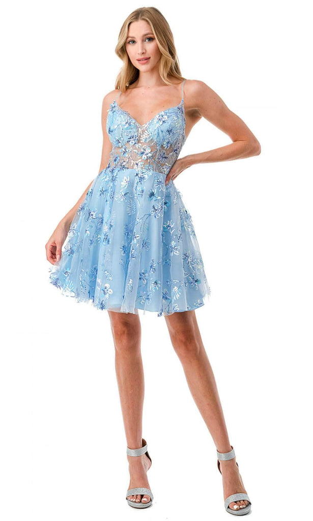 Aspeed Design S2731 blooms with enchantment, celebrating the beauty of nature in every stitch. The gorgeous floral embroideries adorn the dress glamorously, reminiscent of a vibrant garden in full bloom. The sleeveless bodice, crowned with a sweetheart neckline, exudes grace and allure. The open back adds a touch of alluring charm, while the back zipper closure ensures a seamless fit. The short-length A-line skirt flows effortlessly, allowing you to dance with joy and elegance. This Aspeed Design S2731 is a symbol of timeless beauty and femininity, perfect for any occasion where you want to shine like a blossoming flower. Model is wearing Light Blue color.