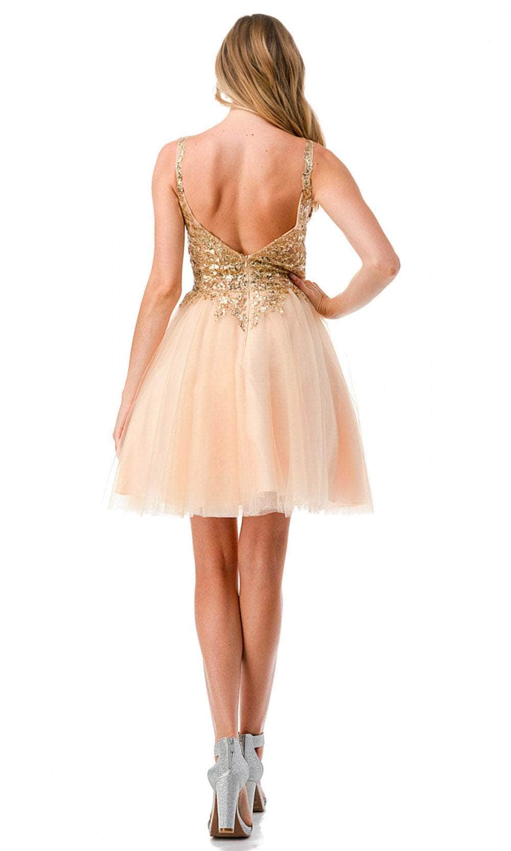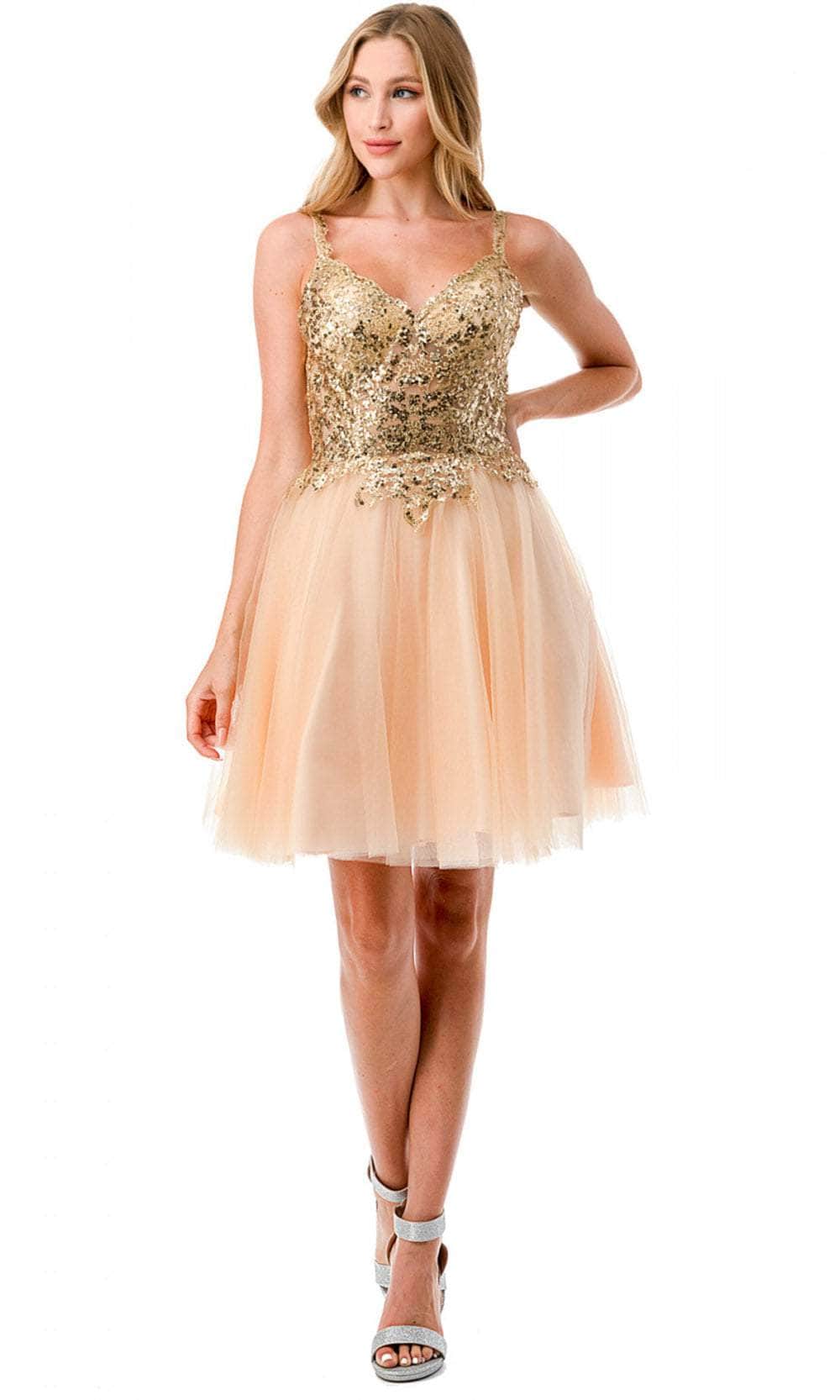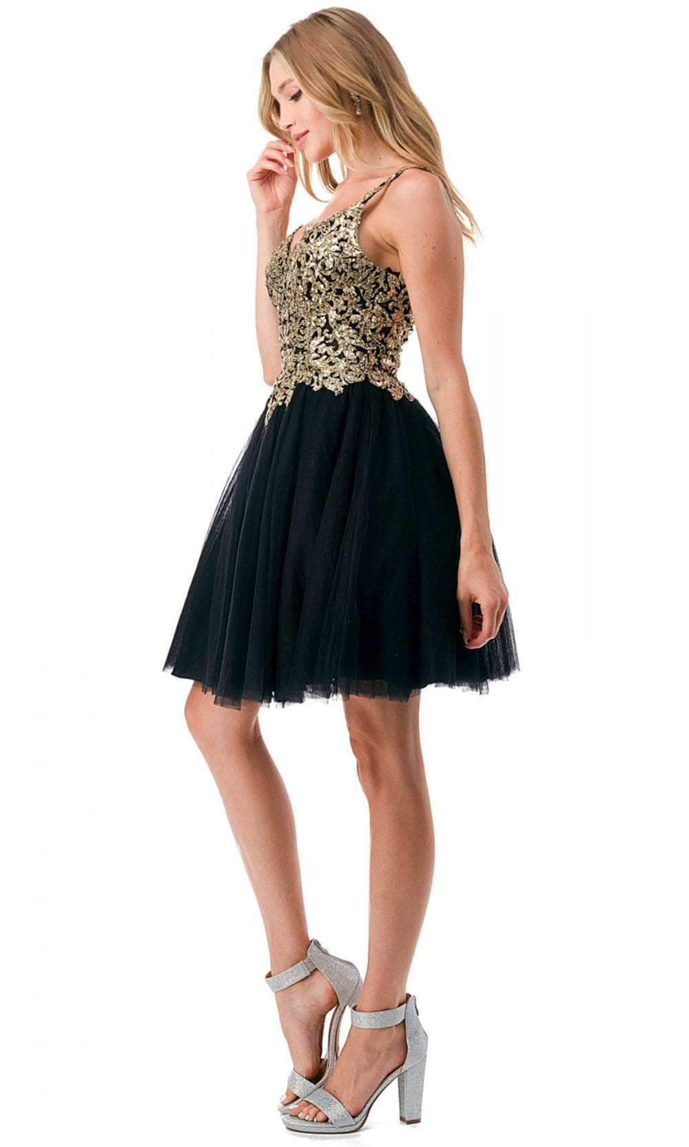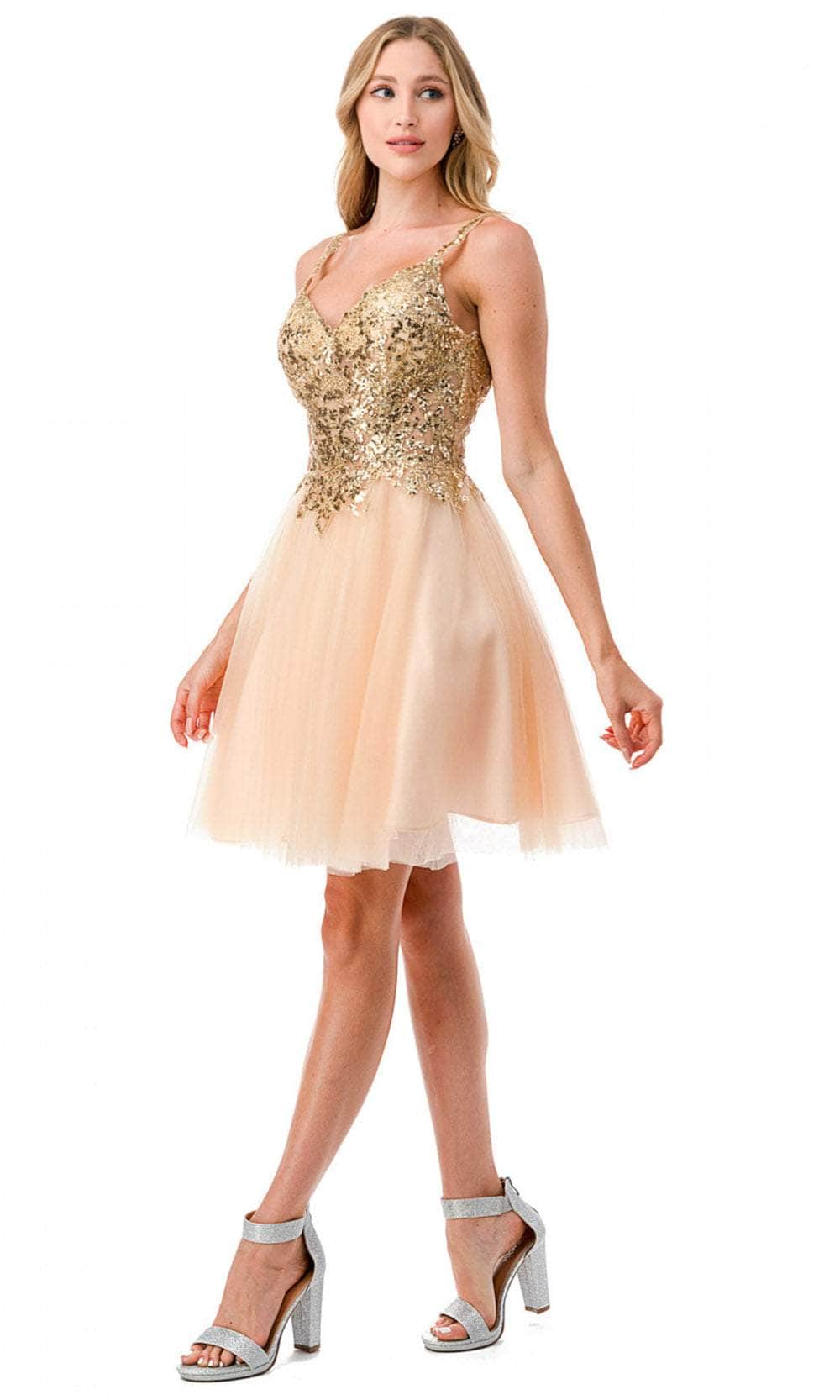 Enter the party with grace and beauty in this Aspeed Design S2757J cocktail dress. Alluringly decorated with lace applique and sparkling beadings on the top bodice, this chic dress catches everyone's attention. It brandishes a v-neckline, spaghetti straps and a daring open back with zipper closure. An A-line skirt with a short hemline completes this look. This Aspeed Design S2757J creation will let you celebrate that divine feminine beauty! Models are wearing the Black-Gold, Champagne-Gold, and Mauve-Silver colors.