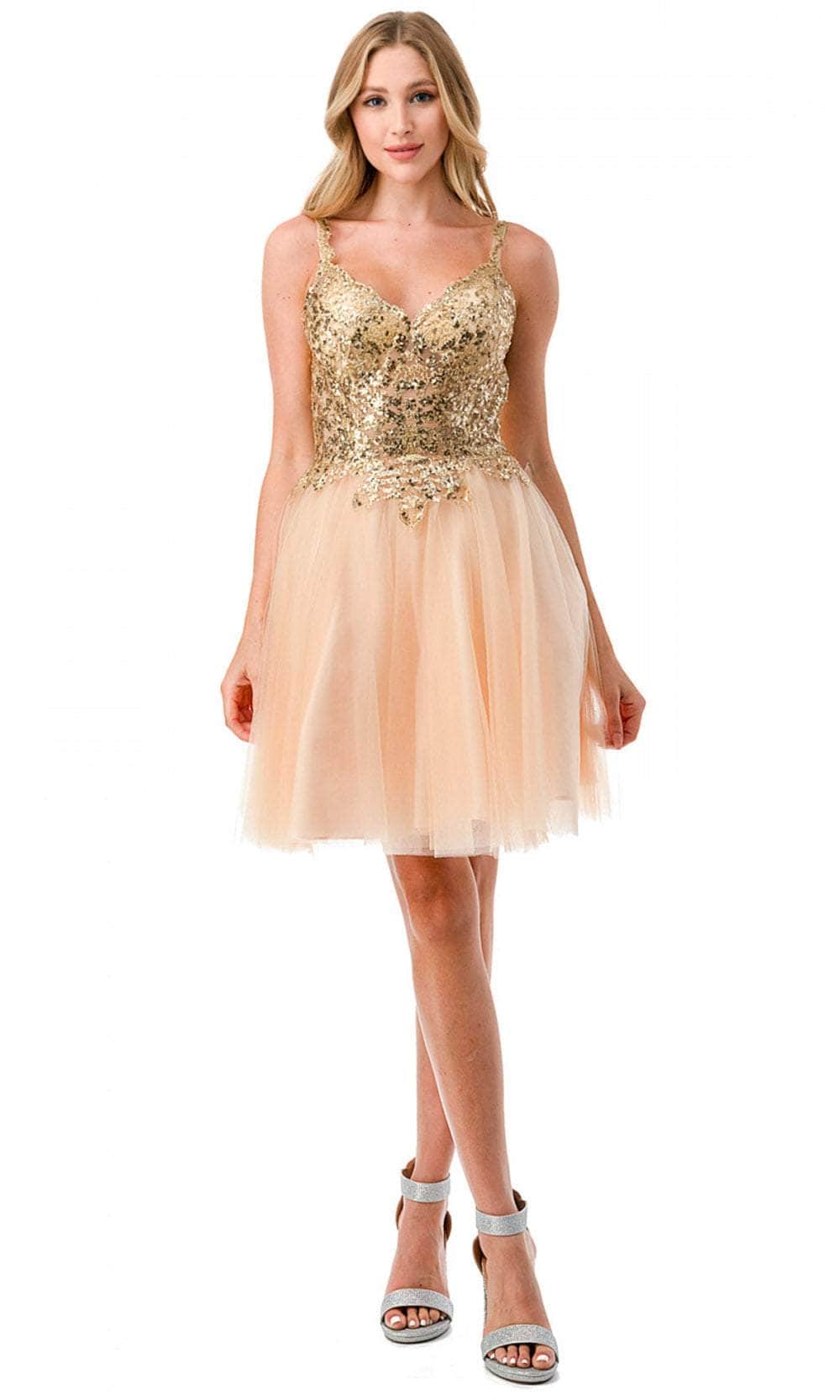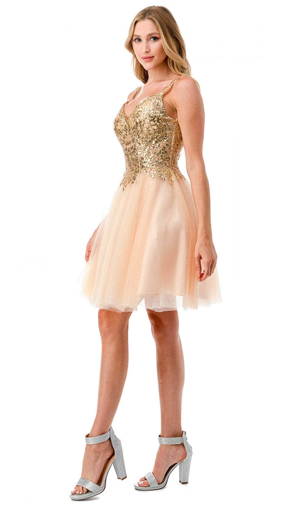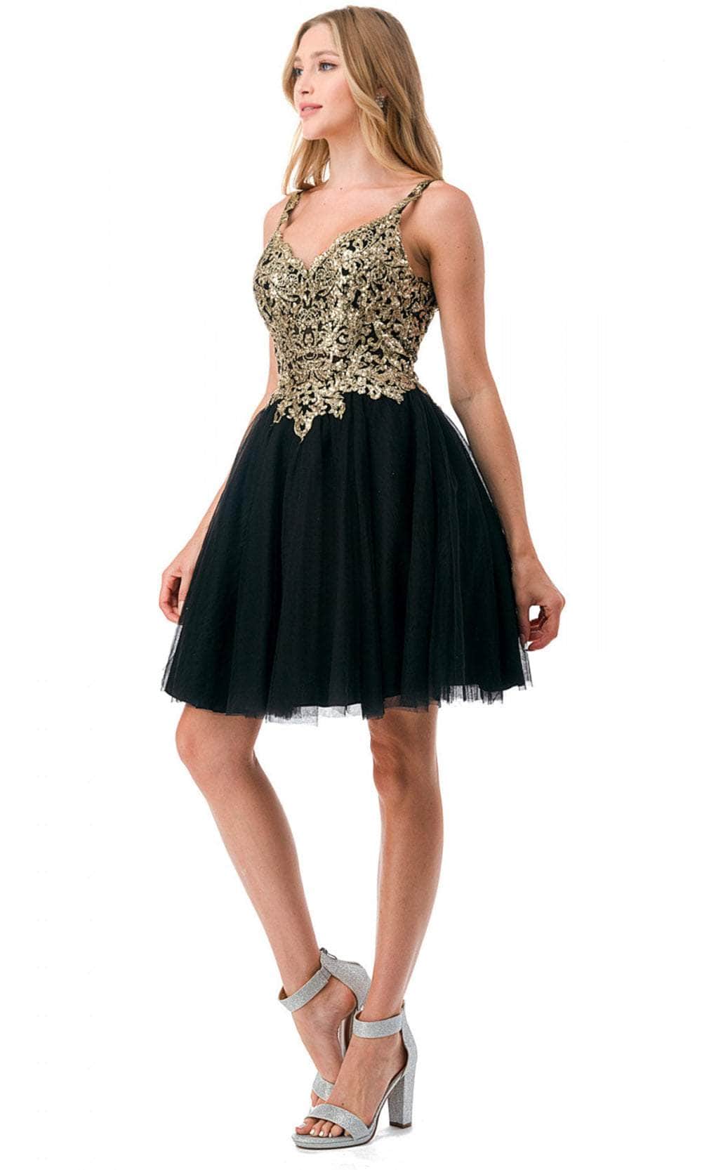 Enter the party with grace and beauty in this Aspeed Design S2757J cocktail dress. Alluringly decorated with lace applique and sparkling beadings on the top bodice, this chic dress catches everyone's attention. It brandishes a v-neckline, spaghetti straps and a daring open back with zipper closure. An A-line skirt with a short hemline completes this look. This Aspeed Design S2757J creation will let you celebrate that divine feminine beauty! Models are wearing the Black-Gold, Champagne-Gold, and Mauve-Silver colors.