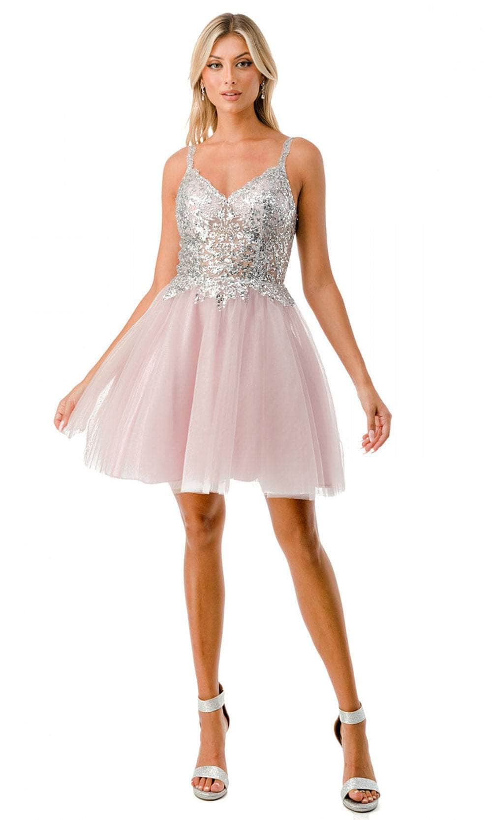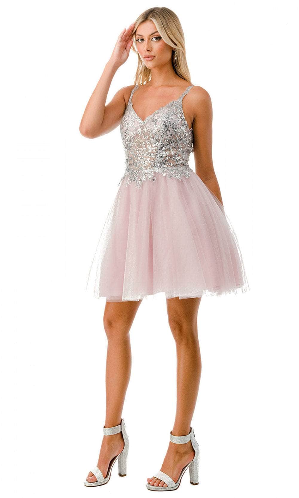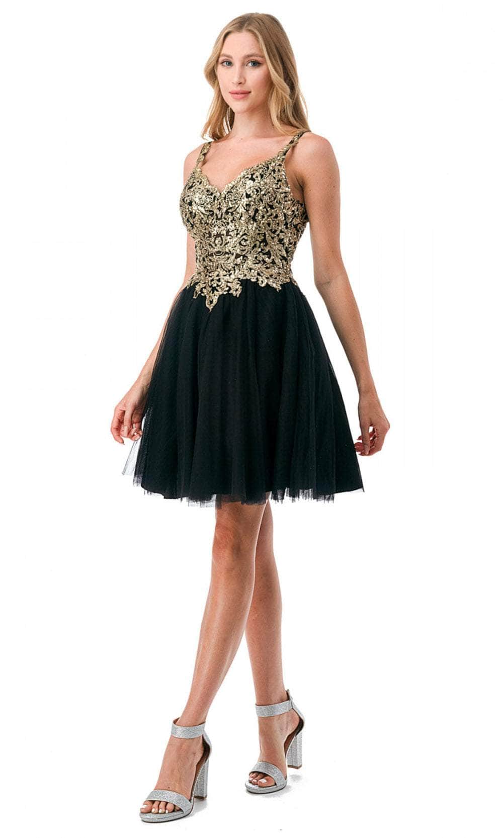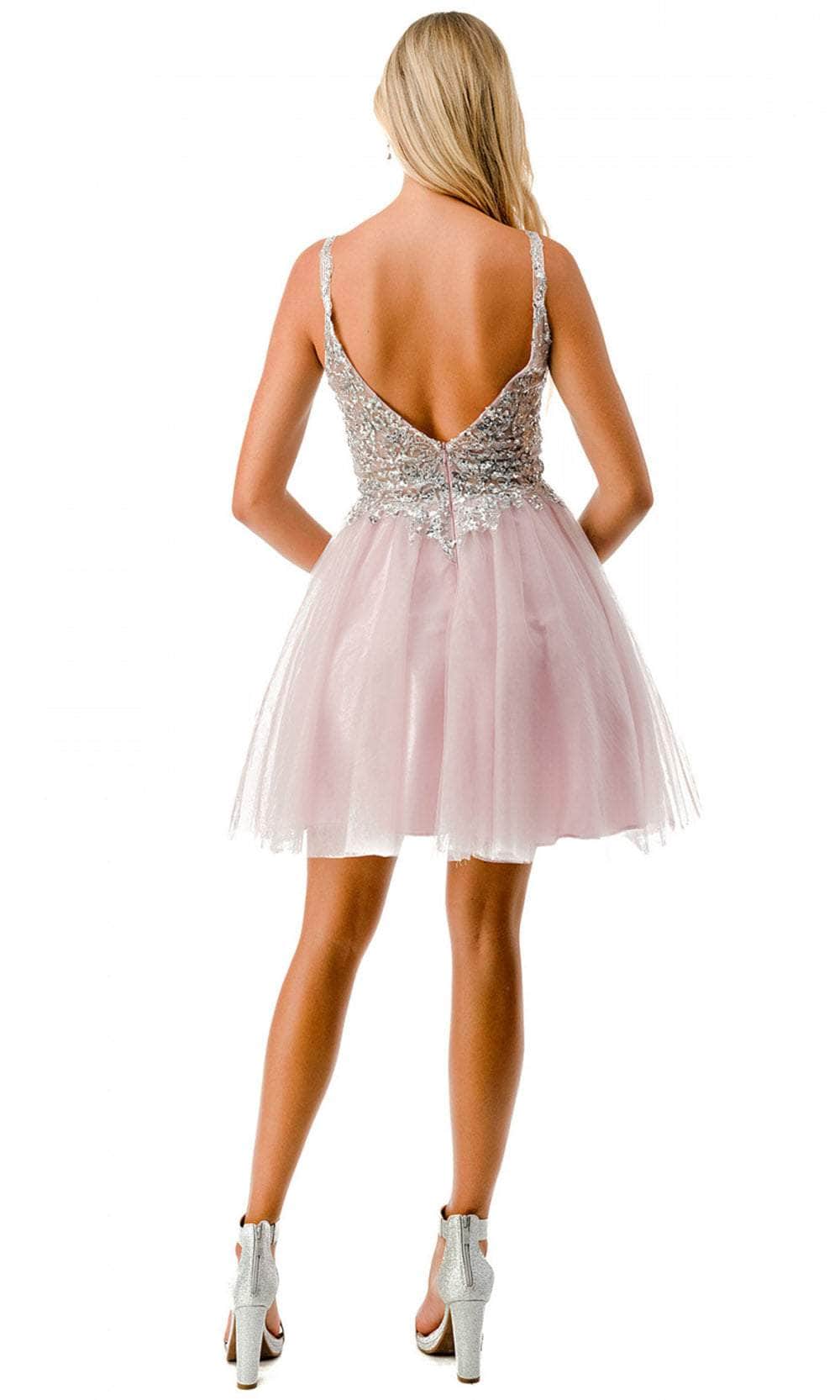 Enter the party with grace and beauty in this Aspeed Design S2757J cocktail dress. Alluringly decorated with lace applique and sparkling beadings on the top bodice, this chic dress catches everyone's attention. It brandishes a v-neckline, spaghetti straps and a daring open back with zipper closure. An A-line skirt with a short hemline completes this look. This Aspeed Design S2757J creation will let you celebrate that divine feminine beauty! Models are wearing the Black-Gold, Champagne-Gold, and Mauve-Silver colors.