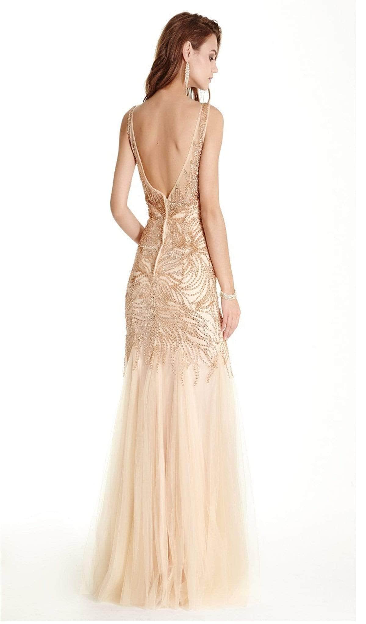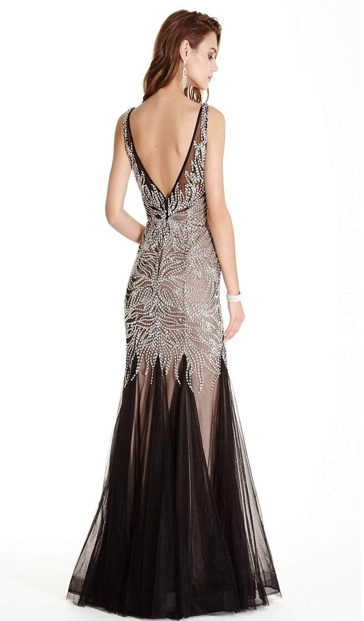 | Details: | Sleeveless, Plunging neckline, Mesh, Fitted bodice, Low V-back, Trumpet skirt |