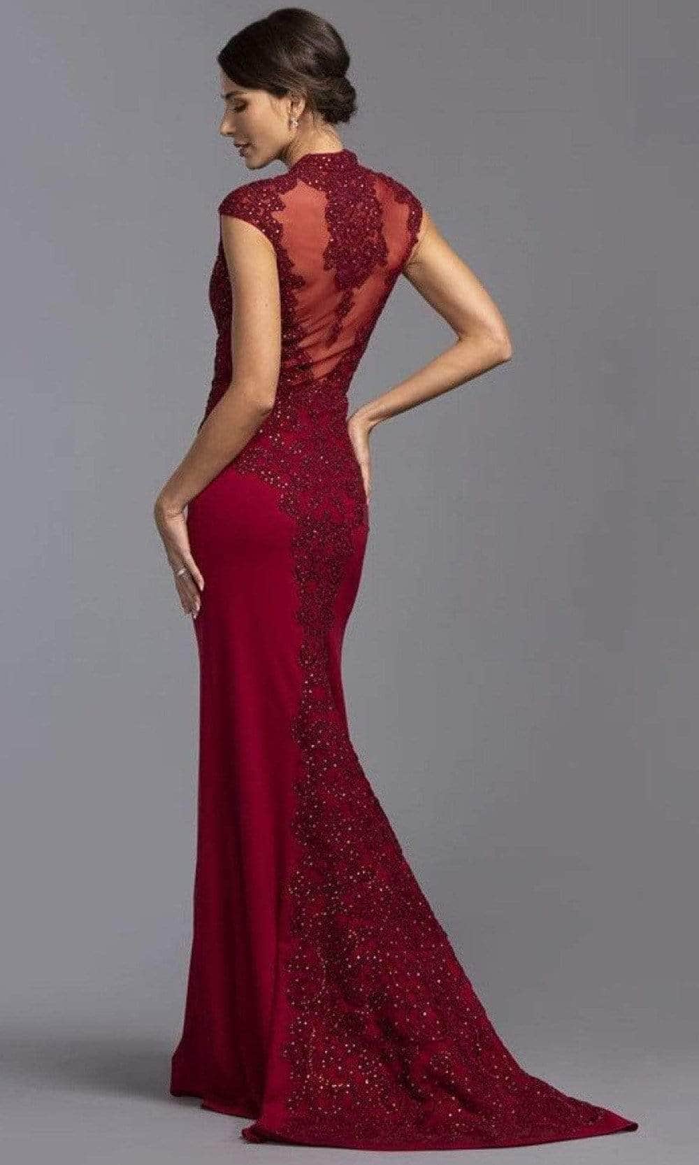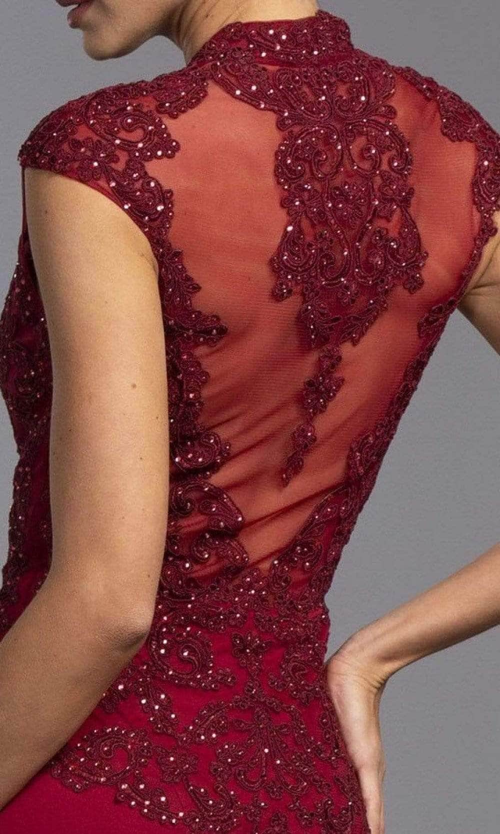 This dress highlights a sweetheart neckline supported by cap sleeves in a beaded and embroidered bodice. Revealing a sheath silhouette, this also shows a full back to complete the look. Model is wearing the Burgundy color.