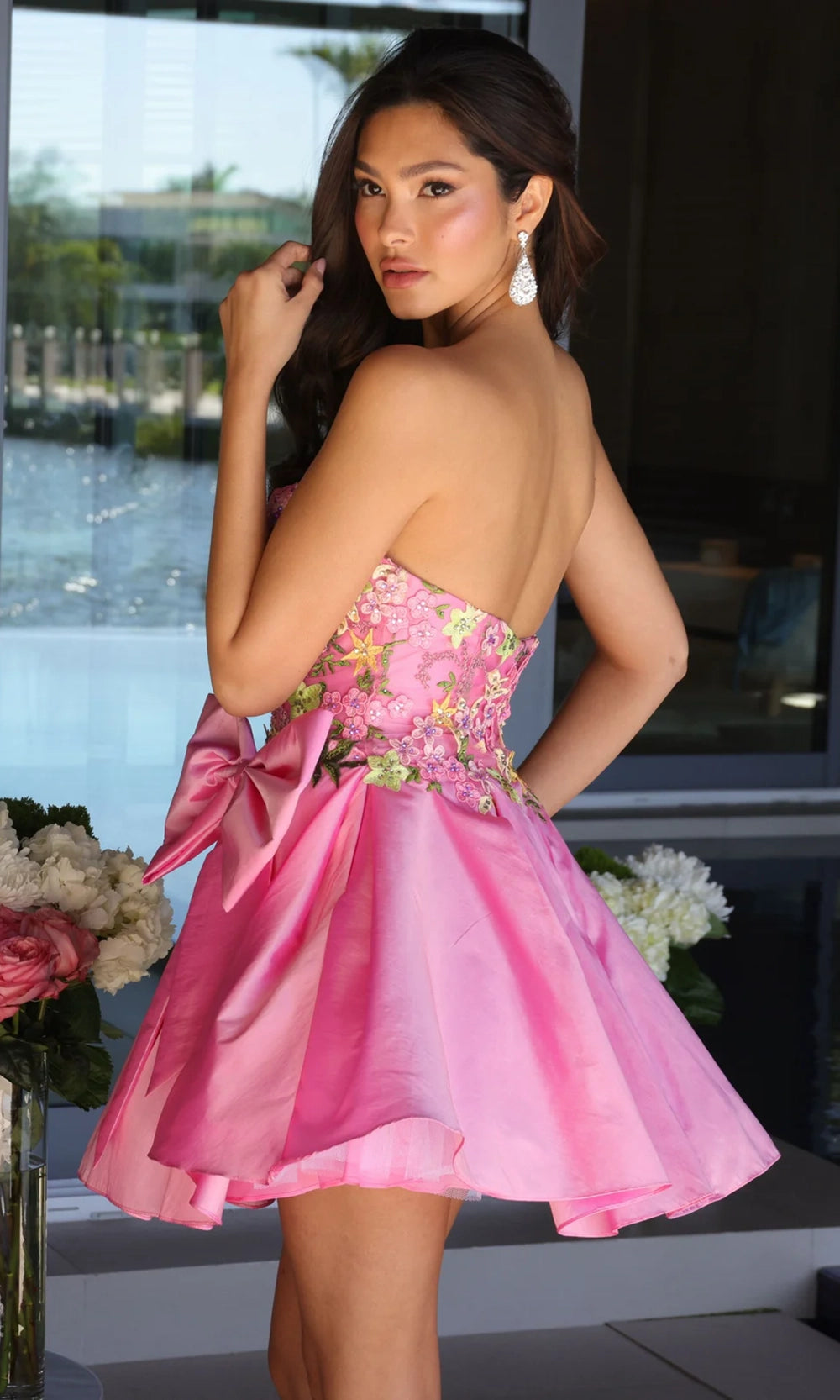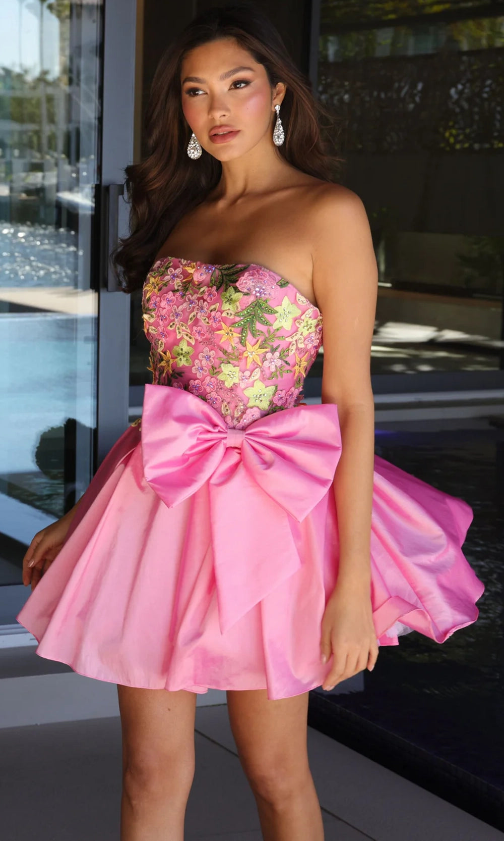 Infused with charm and flair, the Ava Presley 26347 is a celebration of color and volume. The strapless bodice dazzles with multicolor floral embroidery, while the oversized taffeta bow at the waistline and straight across neckline adds a captivating focal point. A short A-line skirt offers just the right amount of playful drama for a standout look. Perfect for making memories in style, the Ava Presley 26347 brings whimsical elegance to your wardrobe with its blend of texture, structure, and bold floral accents. Model is wearing Hot Pink color.