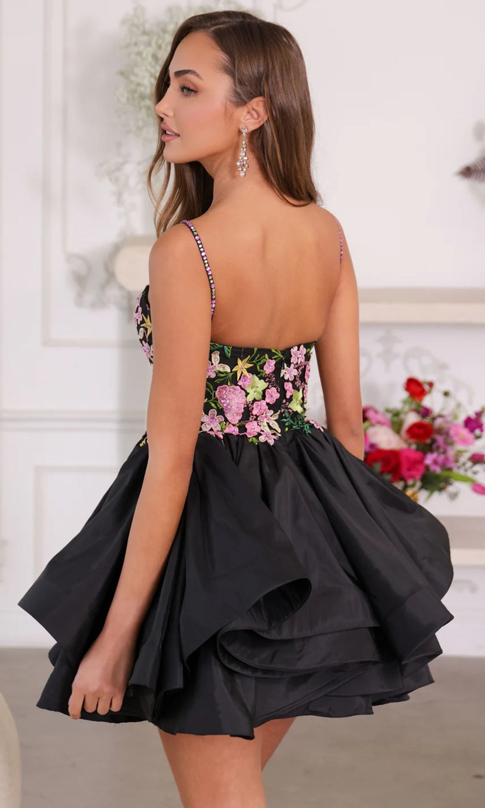 Floral artistry meets playful elegance in Ava Presley 26348 creation. This A-line mini dress highlights a sweetheart neckline and a fitted upper bodice adorned with 3D rosette and colorful floral embroidery that add dimensional beauty. The cutout detail beneath the bust enhances the overall allure while the voluminous layered skirt adds a touch of youthful flair. Ideal for anyone who wants to make a statement with sophistication and charm. Ava Presley 26348 brings a stunning blend of feminine design and eye-catching texture perfect for any fashionable celebration. Models are wearing Black, and Ice Pink colors.
