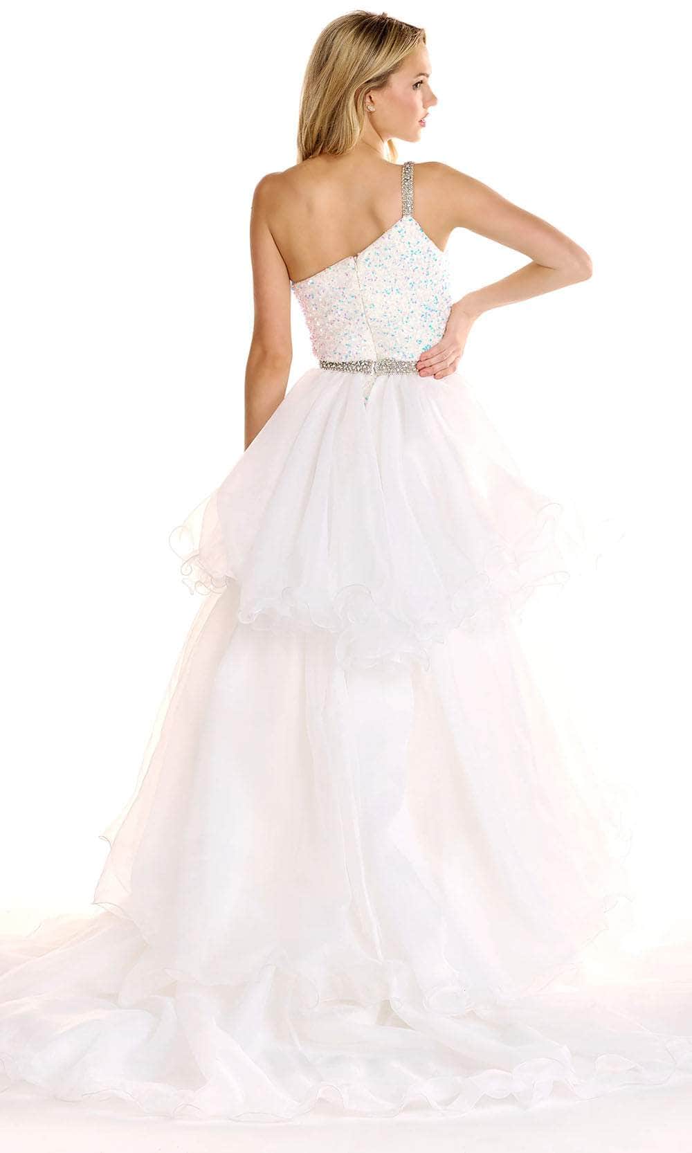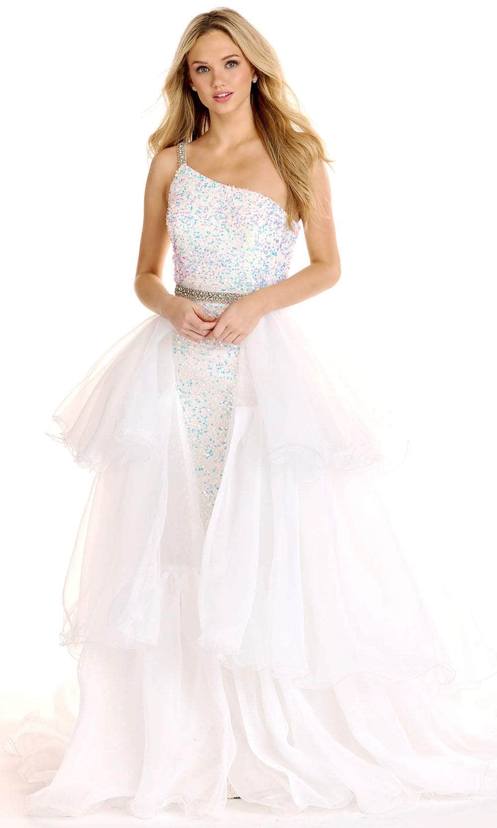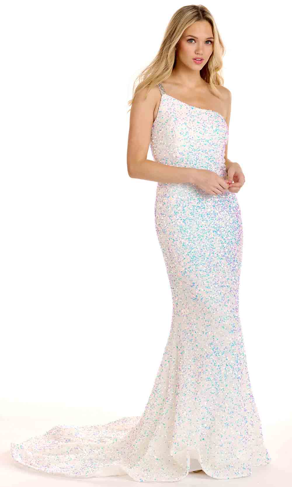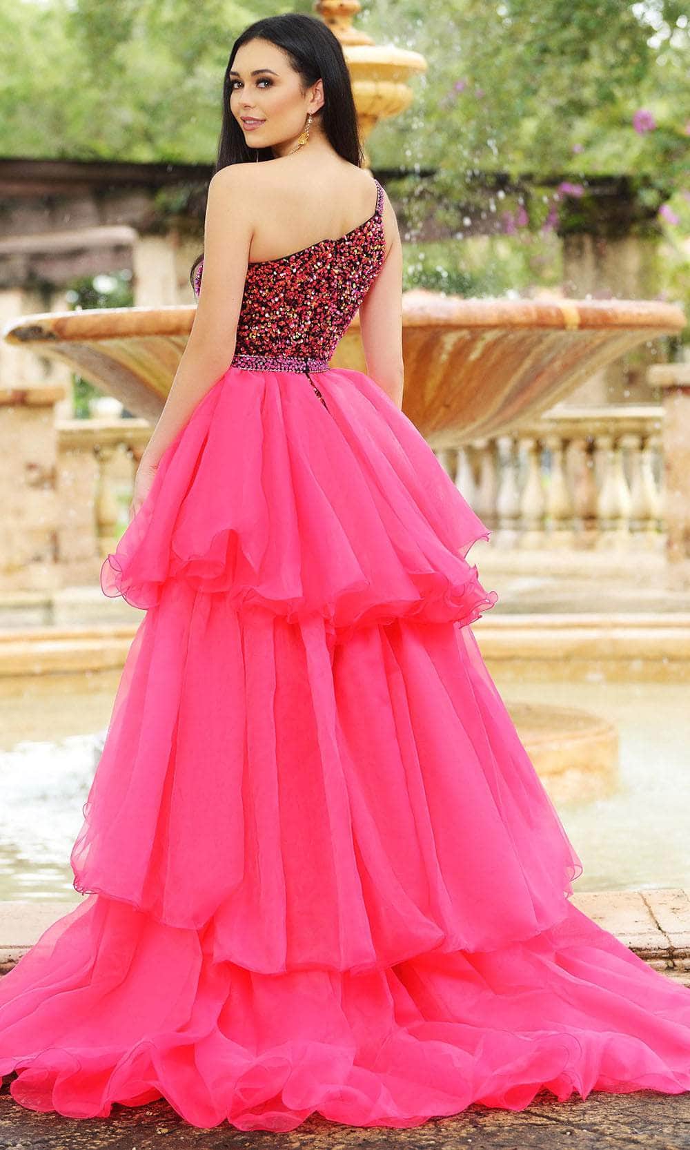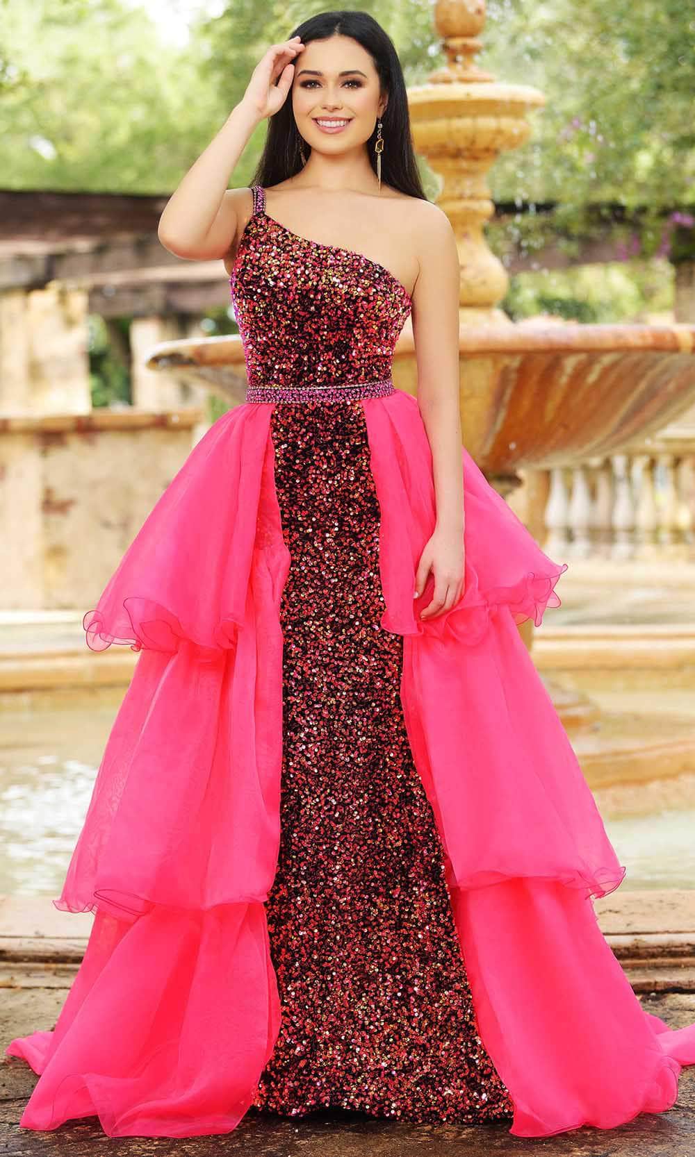 Radiate an irresistible charm while donning this captivating Ava Presley 27715 creation. This remarkable gown boasts an asymmetric neckline, delicately upheld by slender single-sided spaghetti straps. The A-line skirt shimmers adorned with sequins, accentuated by a detachable belt adorned with a contrasting overlay of multi-tiered layers. With graceful allure, the gown flows seamlessly to the floor, concluding with a subtle sweep train. Steal hearts of all who behold you in this vibrant Ava Presley 27715 masterpiece. Models are wearing the Black/Hot Pink and Iridescent White colors.