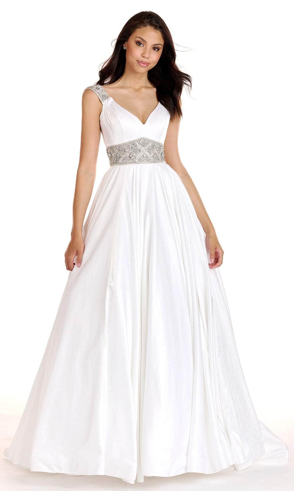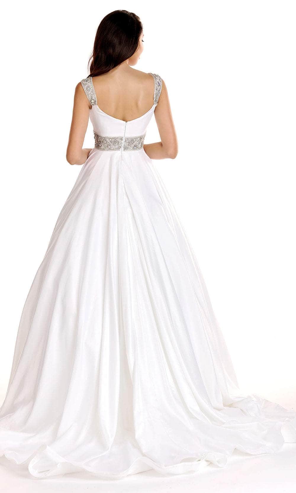 Experience the perfect fusion of opulence and grace when you don this Ava Presley 27796 creation. Stylishly tailored with seam sculpting details on a rich satin silhouette, this sleeveless stunner parades a contoured v-neckline flanked with tank straps accented with scintillating jewels. Defined with a cinched natural waist accented with a spectacle of gems, this piece also parades a scoop back and a concealed zipper closure. The voluminous skirt cascades beautifully in a spill of trailing train. Embark on a journey of regal splendor and magnificence with this opulent Ava Presley 27796 masterpiece. Model is wearing the White color.
