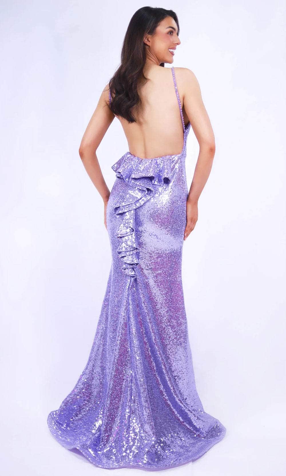Embrace a wonderful evening in this creation by Ava Presley 27815. The sleeveless gown has an all-over brilliant sequin embellishment that attracts the attention of everyone. The beaded thin straps frame the shoulders and provide support to the v-neckline. The backless design is sure to be breathtaking, accompanied by cascading ruffles. Ending with sweeping train and beautiful horsehair trim, the skirt makes a mermaid silhouette that slides to the full length hem. The night is yours in a spectacular gown from Ava Presley 27815. Model is wearing the Lilac color.