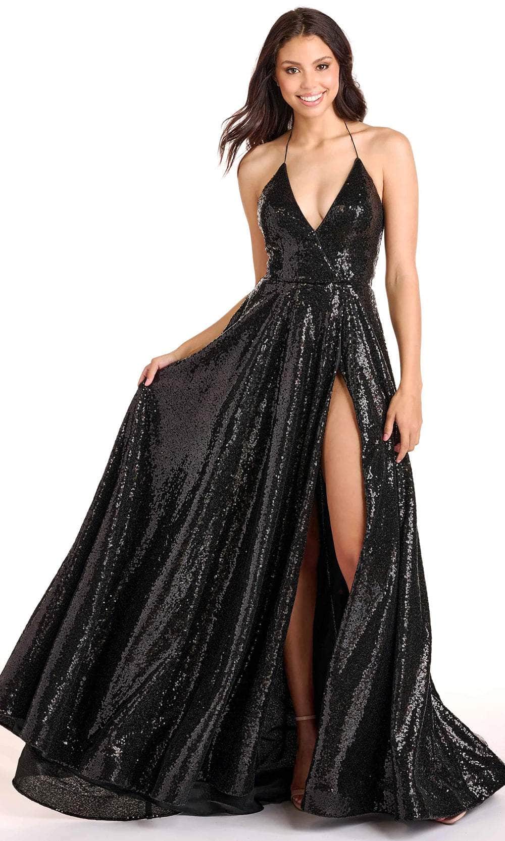 Light up the night in this eye-catching Ava Presley 27825 masterpiece. Sumptuously ornamented with radiant sequins, this sleeveless gown displays a surplice deep v-neckline, and halter-style spaghetti straps that pleasingly frame your shoulder. The backless design and front thigh-high leg slit provide a hint of enticement. The skirt forms an A-line silhouette that perfectly falls to the sweeping train. This Ava Presley 27825 creation is truly a definition of glamour. Models are wearing the Black, and Rose Gold colors.
