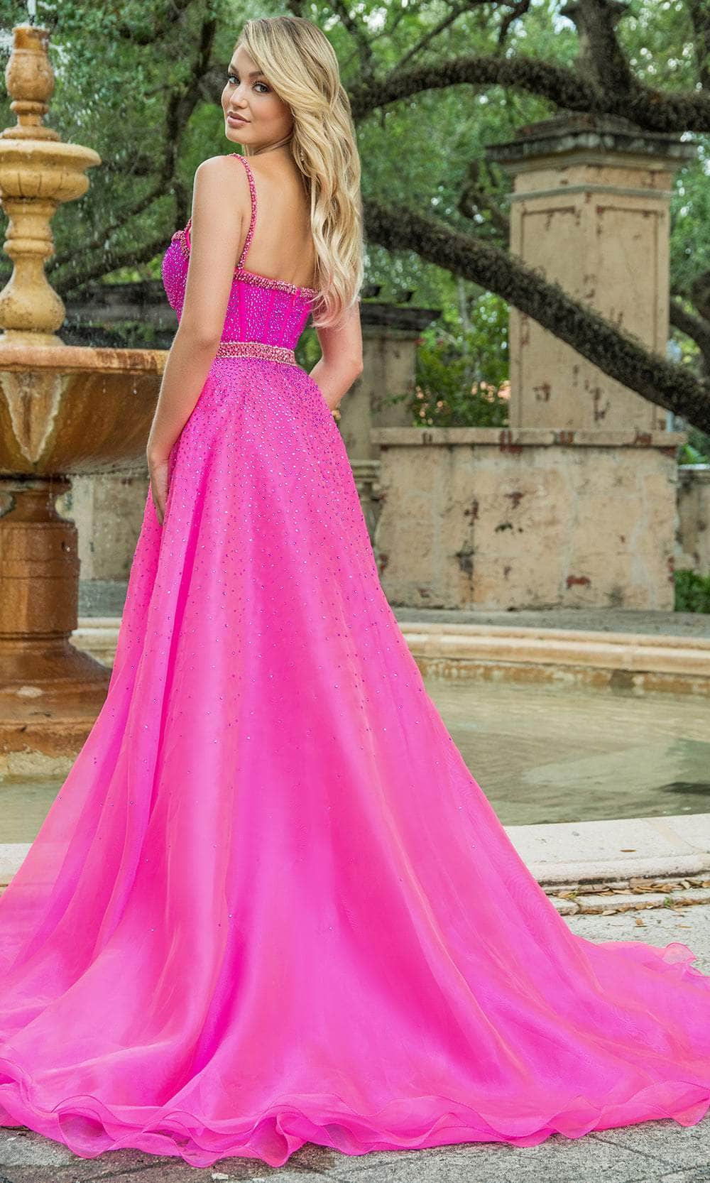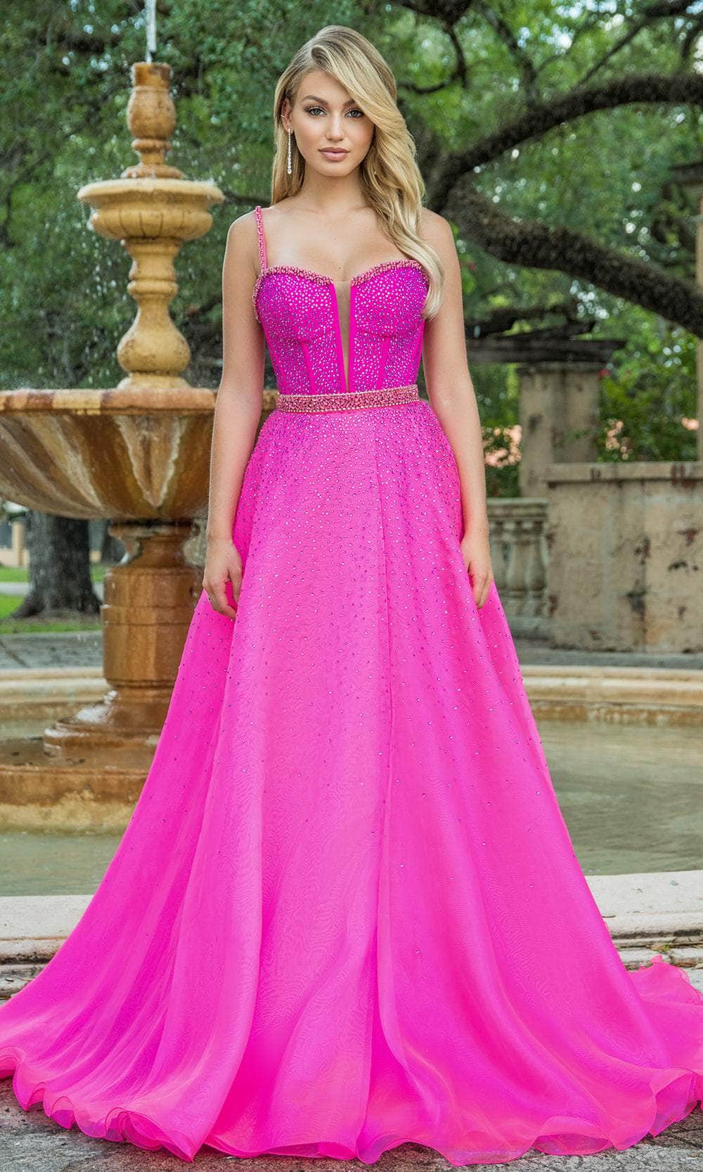 Ava Presley 28581 is a sleeveless dress that radiates elegance and allure. Adorned with a dazzling hot stone set, it exudes a captivating charm. The corset bodice, complete with a delicate sheer insert, enhances the silhouette's grace and sophistication. The floor-length sheath silhouette skirt, featuring a striking slit, gracefully flows into a train, adding a touch of drama. Ava Presley 28581 ensures a stunning presence fit for the grandest of occasions. Model is wearing Fuchsia colors.