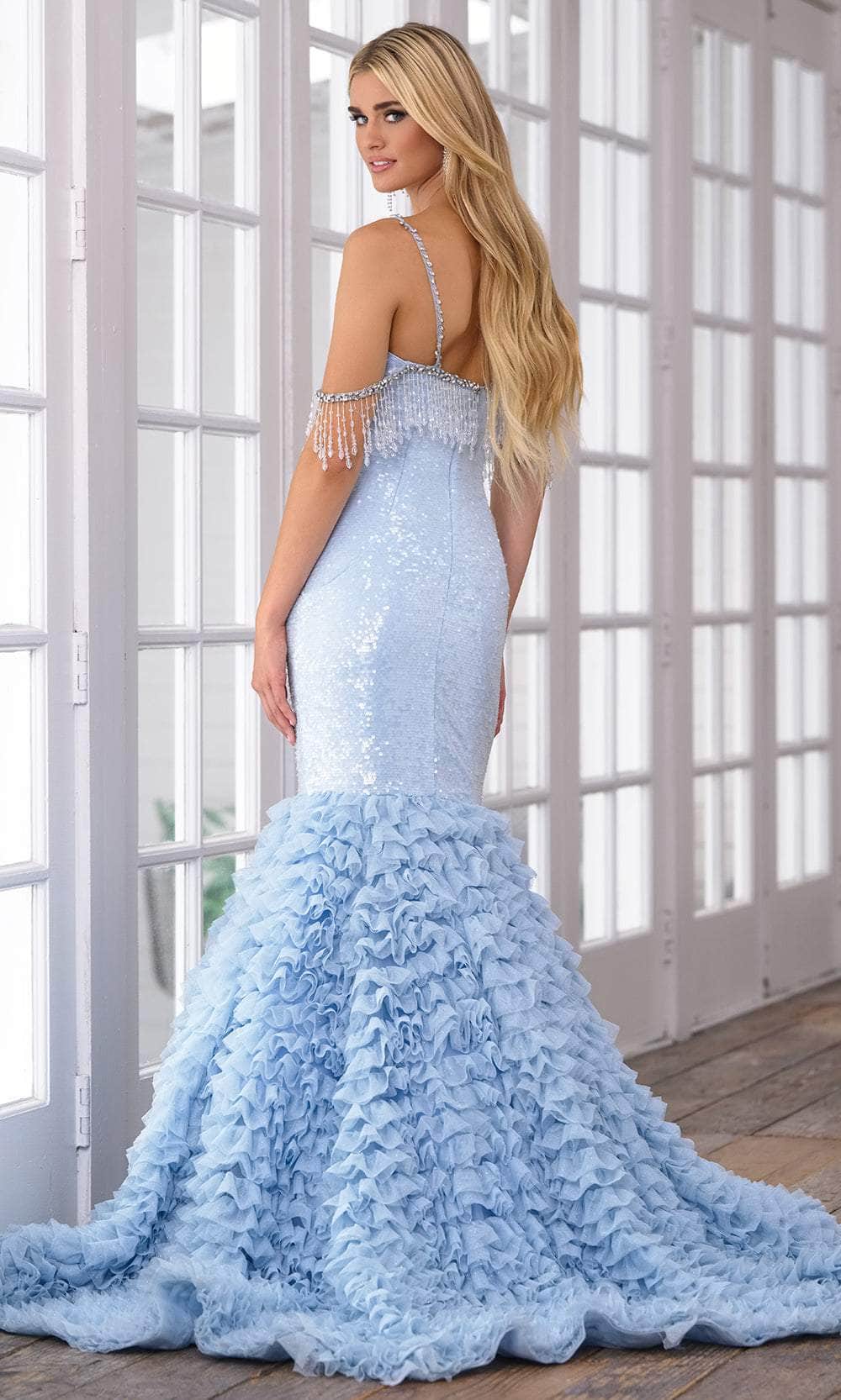 Make a statement with this enchanting Ava Presley 28598, a breathtaking dress that seamlessly blends modern flair with timeless elegance. Cold-shoulder sleeves add a contemporary touch, while the entire ensemble shimmers with exquisite sequin embellishments and meticulous seams, exuding a sense of luxury. The floor-length ruffled skirt, crafted in a mesmerizing mermaid silhouette, is accentuated by delicate crystal fringe details. With a convenient back zipper closure and a graceful train, Ava Presley 28598 ensures a captivating presence fit for any grand occasion. Model is wearing Light Blue color.