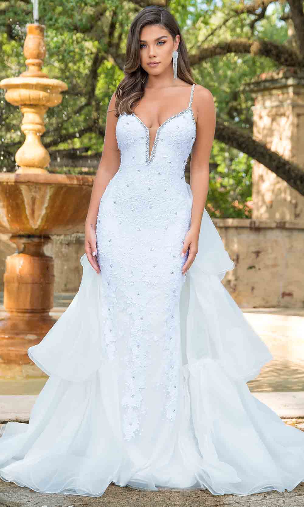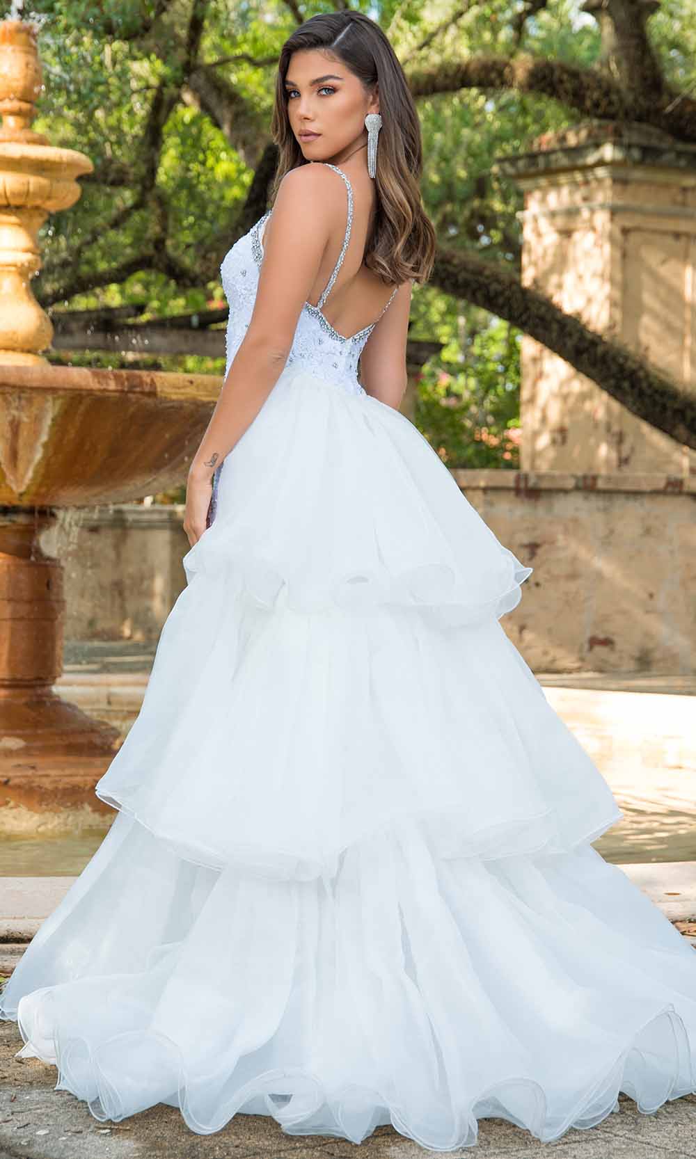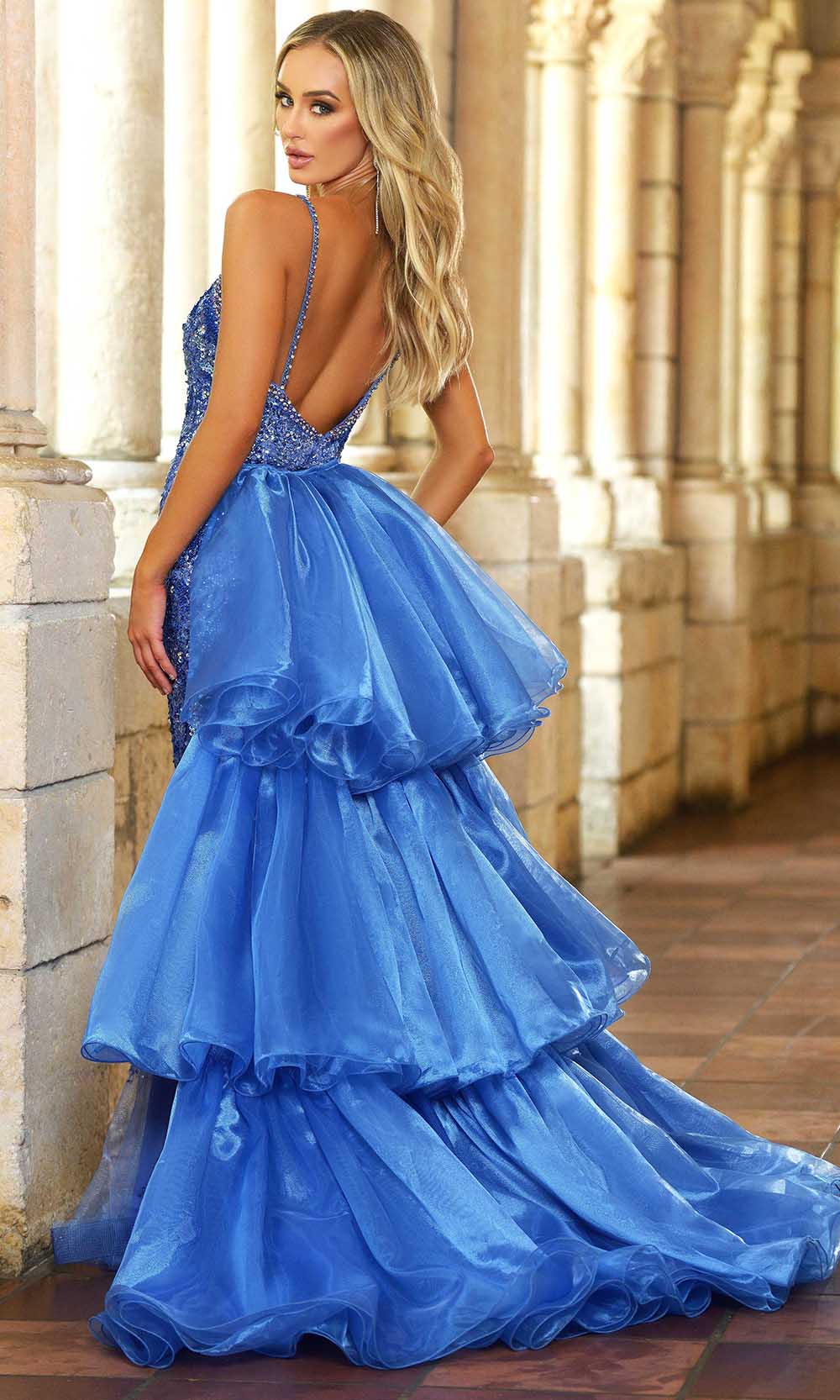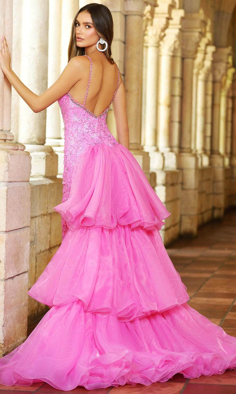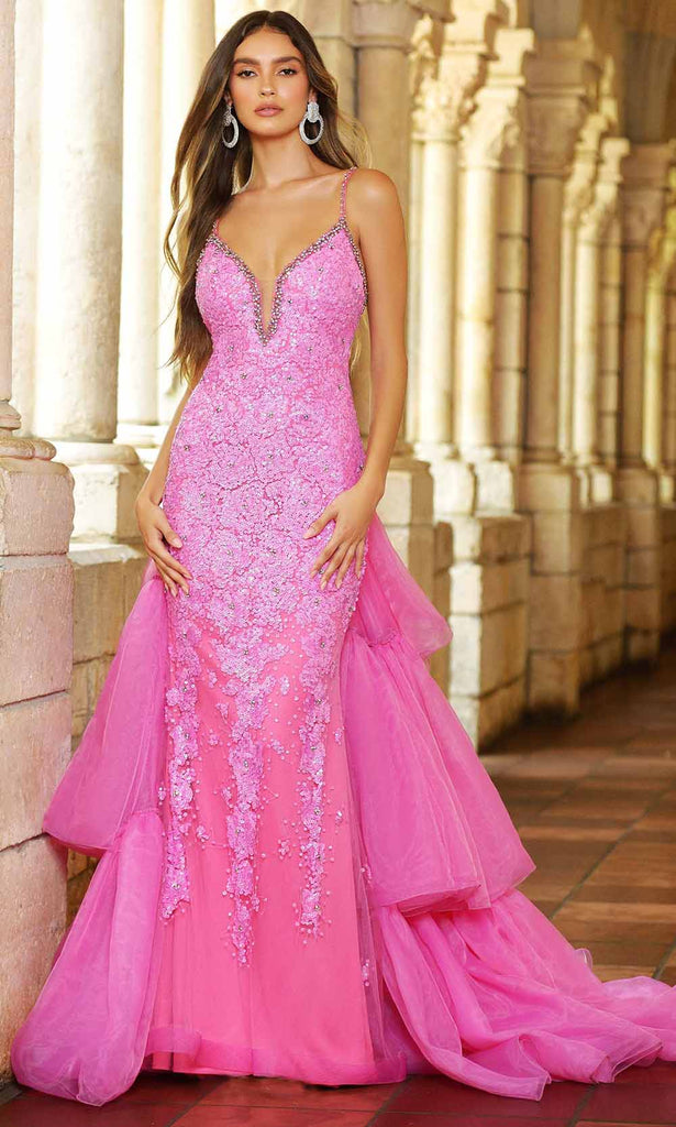 Exude a luminous elegance adorned in the timeless allure of the Ava Presley 38813 creation. Perfectly tailored to sculpt those feminine curves and opulently topped with scintillating sequins, this long gown has a plunging v-neckline with jewels accenting the trim and an illusion inset. Styled with spaghetti straps and a midrise back, this fabulous piece has a ruffled tier ornate back panel. The figure flattering skirt sculpts into a mesmerizing mermaid design, culminating in a sweeping denouement. Indulge in the enchanting embrace of the Ava Presley 38813 masterpiece. Models are wearing the Hot Pink, Periwinkle, and White colors.