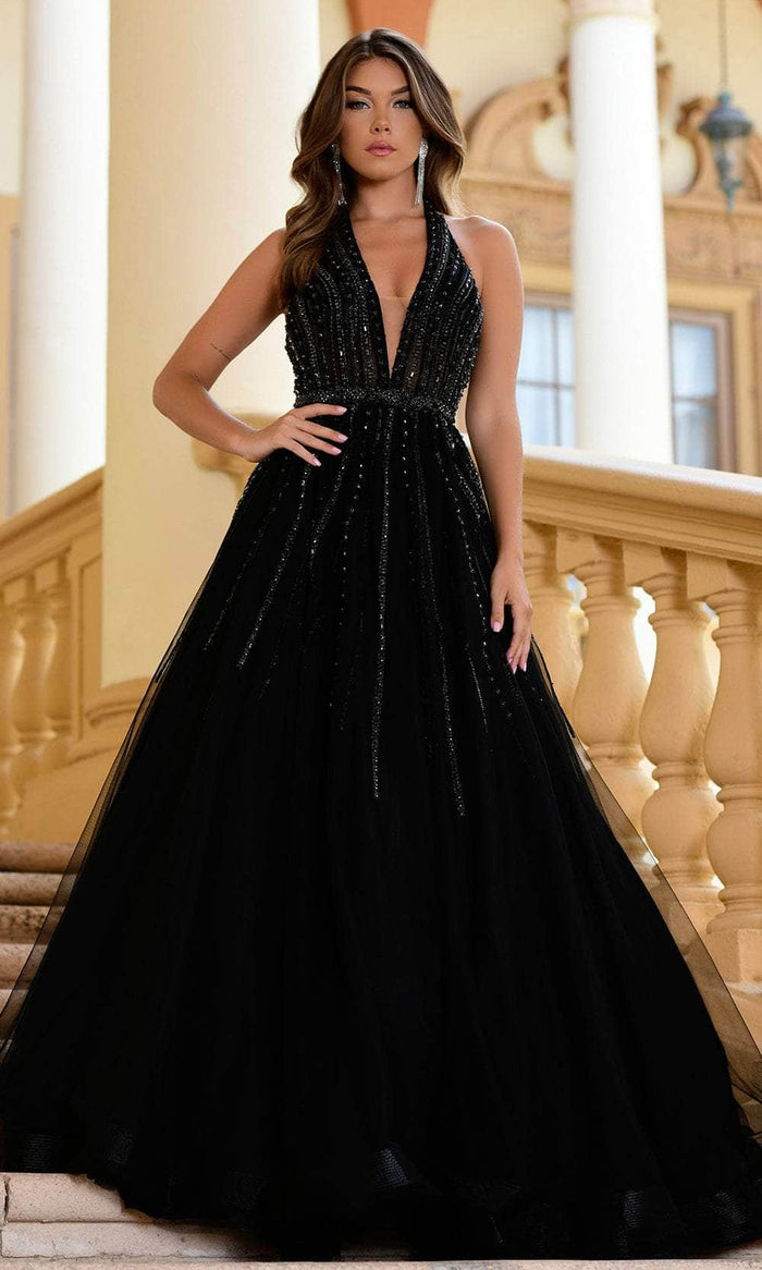 Steal the spotlight in Ava Presley 38926, a mesmerizing sleeveless ballgown designed to make a grand entrance. The beaded and sequined embellished bodice creates a dazzling focal point, leading to a plunging neckline with a sheer insert. Halter straps add a touch of sophistication, while a beaded natural waistline enhances the silhouette. With a show-stopping back zipper closure, this gown promises to make you the center of attention on any special occasion, radiating elegance and glamour in Ava Presley 38926 Model is wearing Black color.