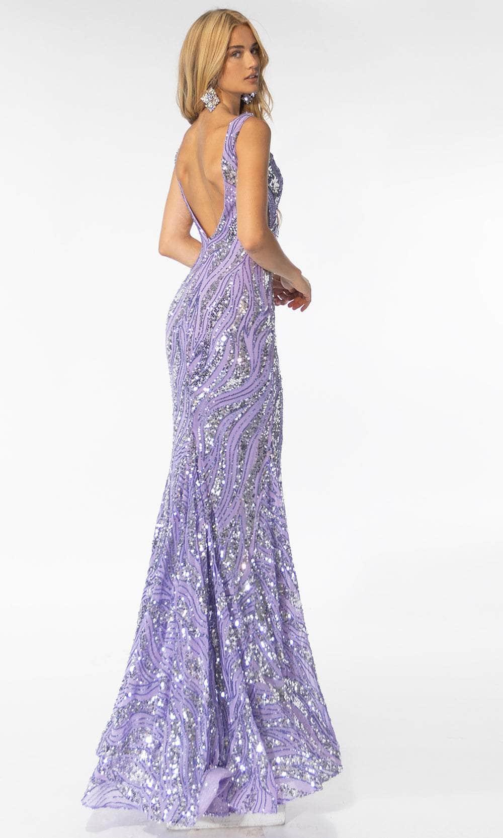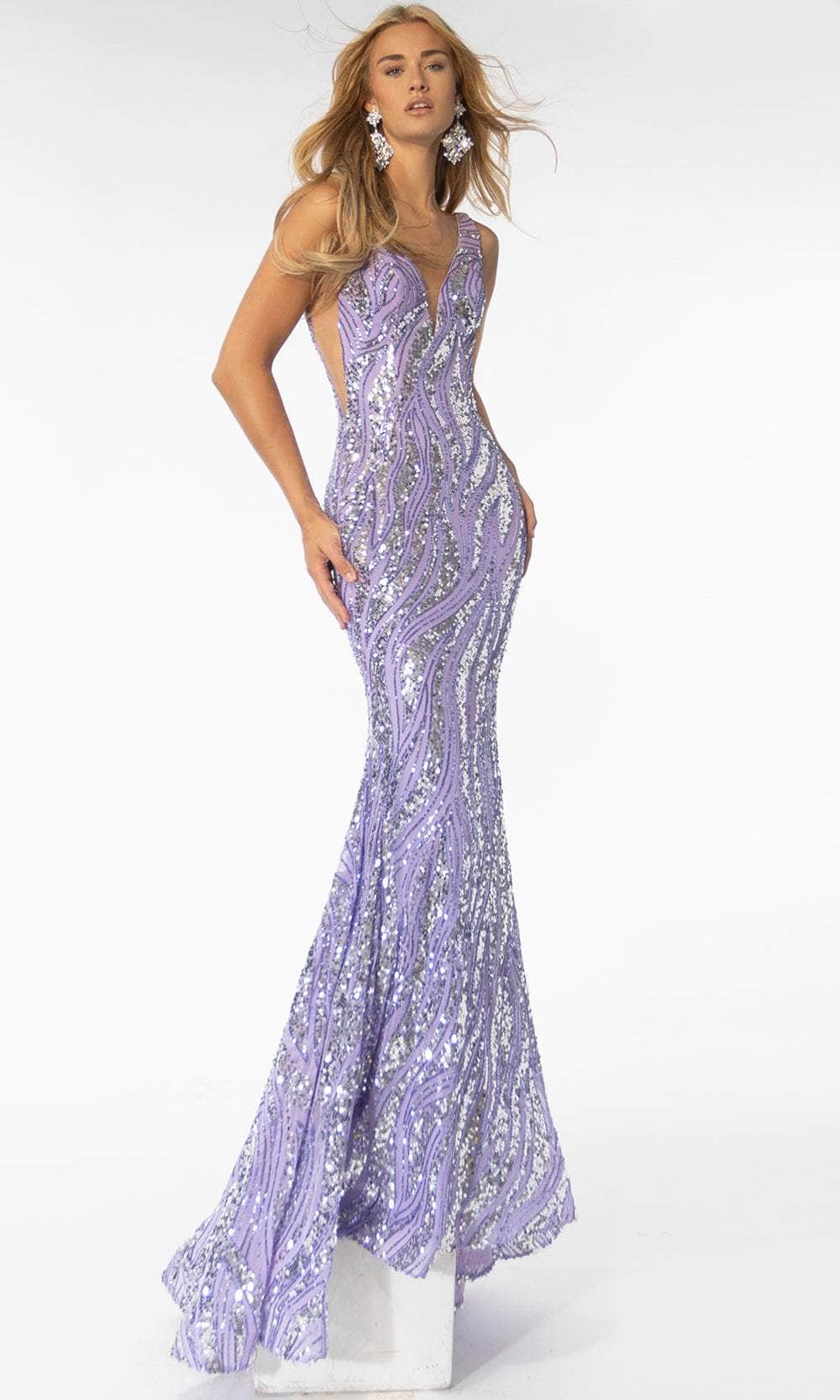 Turn heads and make a statement in Ava Presley 39201, a captivating sleeveless evening gown designed to showcase your elegance. The plunging V-neckline, adorned with a sheer insert, creates a striking focal point, complemented by alluring side mesh panels and straps. The open back, secured with a zipper closure, adds a touch of allure. The floor-length skirt gracefully flows in a mermaid silhouette, culminating in a breathtaking train. Make an unforgettable entrance at any special event in this Ava Presley 39201 masterpiece. Model is wearing Lilac color.