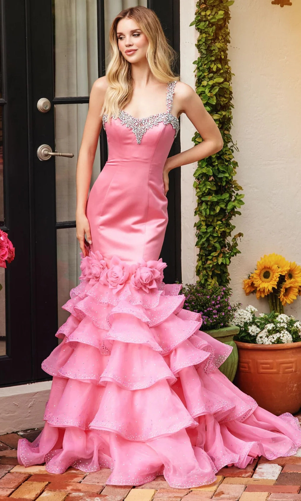 A celebration of floral romance and dramatic flare defines the Ava Presley 39566 gown. Sparkling beaded straps draw the eye upward, while a heart shaped neckline offers structure and allure. The 3D floral detail at the hip transitions into multi-layered ruffles with subtle shimmer, bringing fullness and movement to the mermaid silhouette. Each ruffle creates depth and visual texture for a look that feels festive and graceful. Ava Presley 39566 is a refined statement made for evening events where standout style is key. Models are wearing Hot Pink, and White colors.