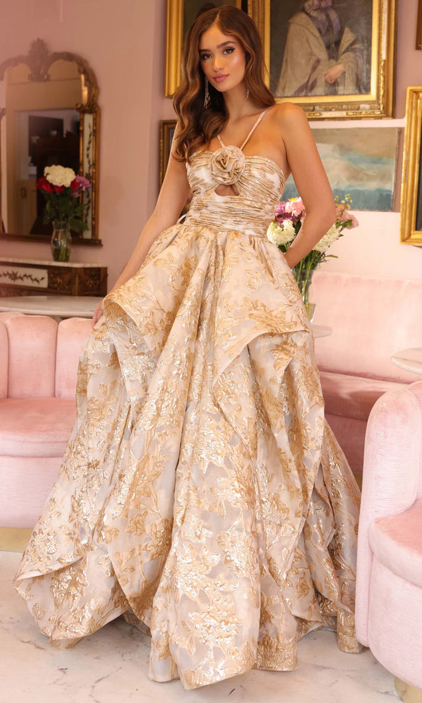 Whimsical and regal elements unite in Ava Presley 40049 creation. Featuring a structured sweetheart bodice with ruched detailing and spaghetti straps, this gown is instantly elevated by a 3D rose applique at the center front. The skirt reveals intricate brocade floral patterns and voluminous layers that cascade into a dramatic silhouette. A defined ballgown shape adds structure while maintaining a sense of graceful movement. Ava Presley 40049 offers a fresh twist on classic glamour, bringing sculptural flair to formal occasions. Model is wearing White/Gold color.