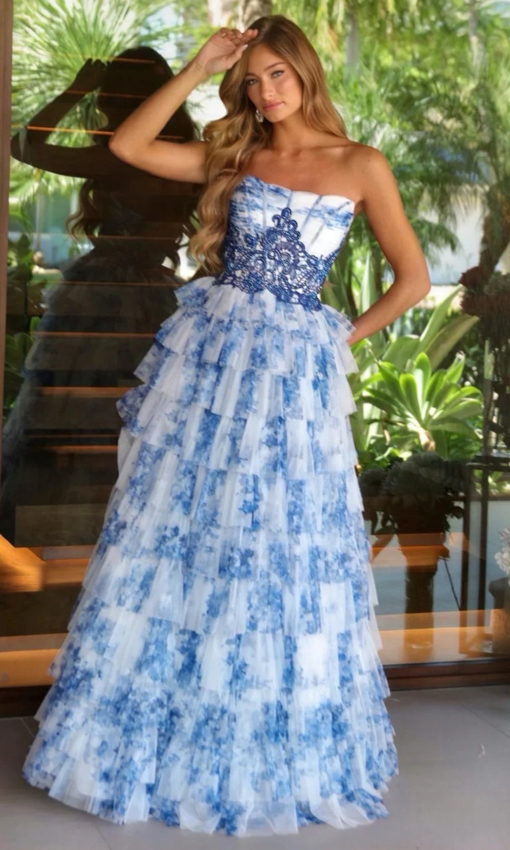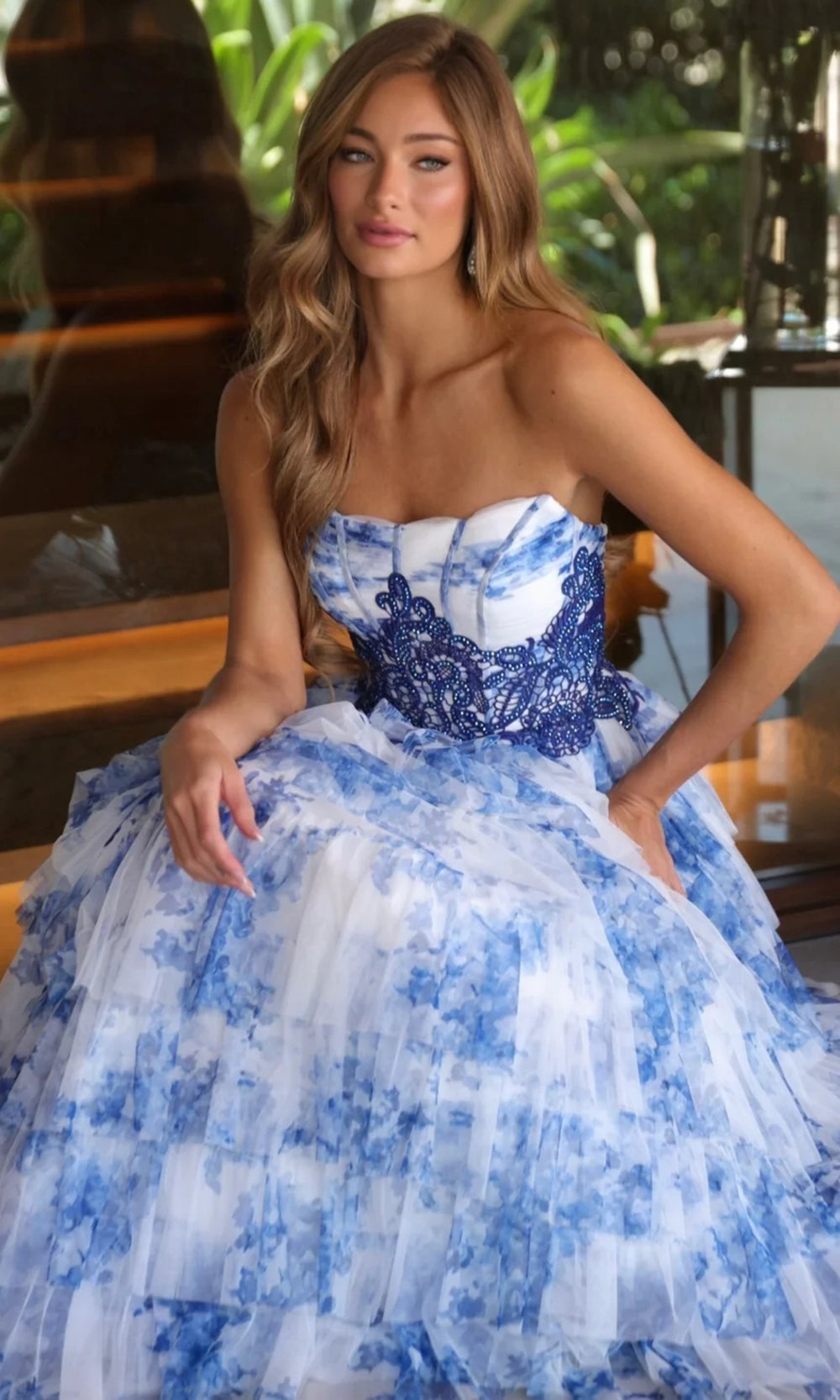 Romantic charm meets dreamy styling in this unforgettable Ava Presley 47106 piece that blends classic inspiration with a modern touch. The gown showcases a structured strapless bodice accented with beaded embroidery. A defined corset waist sculpts the frame before cascading into a tiered ruffled ballgown skirt. The floral print detail adds dimension while maintaining a soft and ethereal look throughout. With its full-length silhouette and fairytale-like movement, the Ava Presley 47106 is a statement gown for any upscale occasion. Model is wearing White/Blue color.