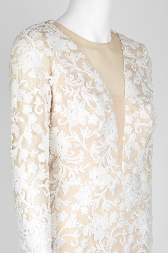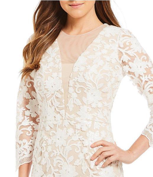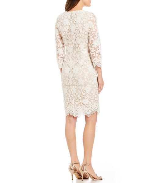 | Details: | Sequined Lace, Illusion Inset, Nude Lining, Sheer Quarter Sleeves, Scalloped Hem, Full Back, Back Zipper Closure, Knee Length Hem |