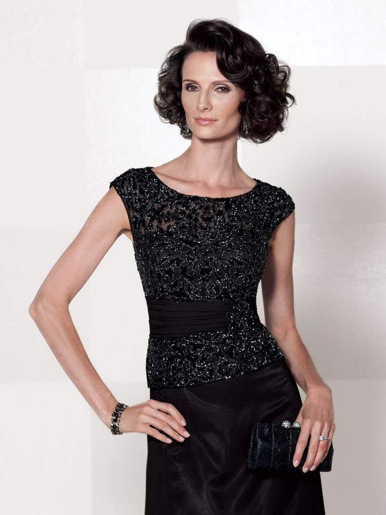 Chiffon mock two-piece A-line dress with hand-beaded illusion cap sleeves, bateau neck beaded illusion over a sweetheart bodice with ruched chiffon midriff accented with side beaded motif, suitable for wedding guests, formal events and cocktail parties. Matching shawl included. Also available with three-quarter length sleeves as 114657SL. Model is wearing Black color.