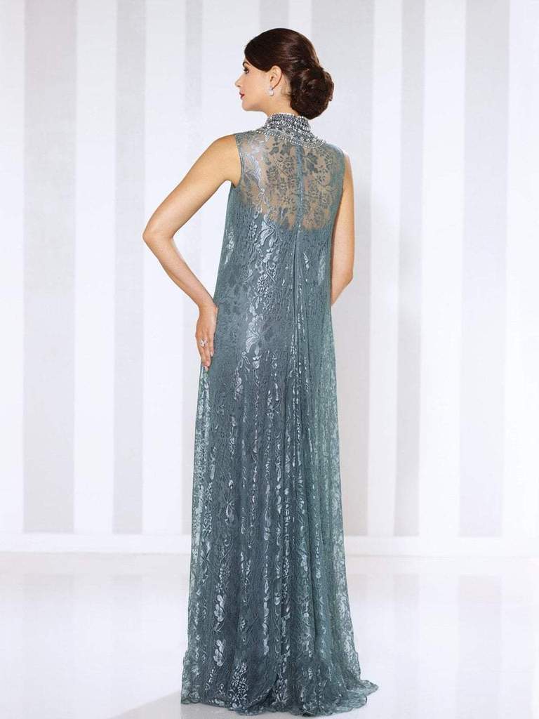 Sleeveless lace A-line gown, illusion ornately hand-beaded jewel neckline, illusion back, slim skirt with voluminous lace overskirt with sweep train. Matching shawl included. Model is wearing Steel Gray color.