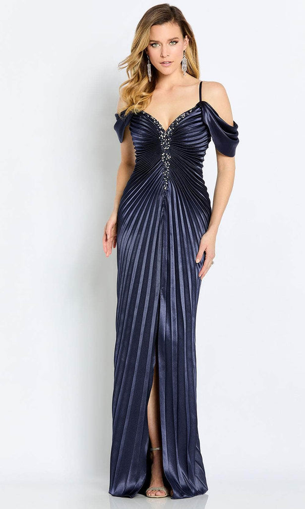Stand out in on your next occasion wearing this Cameron Blake by Mon Cheri CB109 formal gown. Perfect for a young mother of the bride or for a formal gathering, this gown is a great choice. A one-of-a-kind pleated satin gown with an off-the-shoulder beaded sweetheart neckline and cold shoulder style. This gown is designed to flatter the figure and included a shawl for added style and the skirt cascades to a brush train finish. This Mon Cheri design is very stunning! Models are wearing Champagne, Navy Blue, and Rose colors.