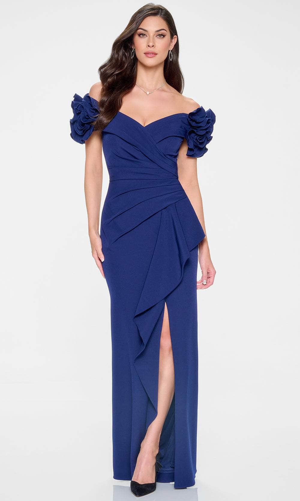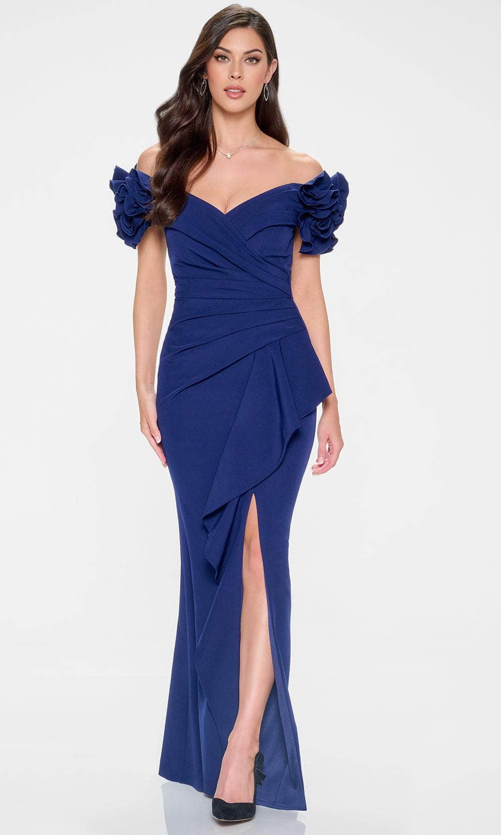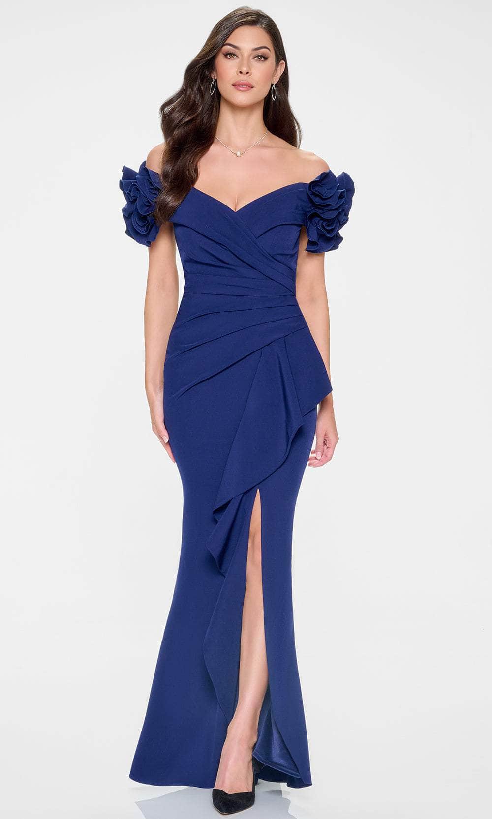 With its exquisite design, Cameron Blake CB209 guarantees a show-stopping and unforgettable look. This masterpiece features off-shoulder neckline and oversized rosette-adorned sleeves that add a romantic touch to its fitted silhouette. The asymmetrical pleated bodice enhances the waist, while a dramatic side slit with ruffles introduces a hint of allure. Crafted from a rich crepe fabric, this gown contours the body beautifully, ensuring a sophisticated and flattering fit. Be dressed up beautifully by Cameron Blake CB209. Models are wearing Navy, Eucalyptus, and Spruce colors.