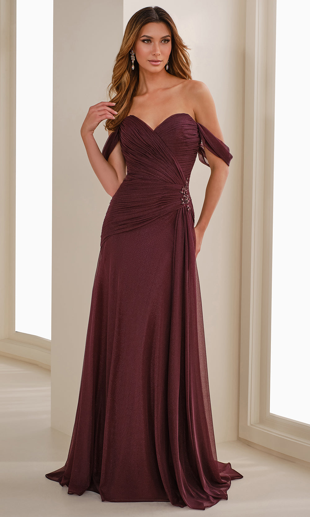 | Details: | Ruched Bodice, Beaded Applique, Open Back, Draped Side Sash, Detachable Off-Shoulder Straps, Matching Shawl |