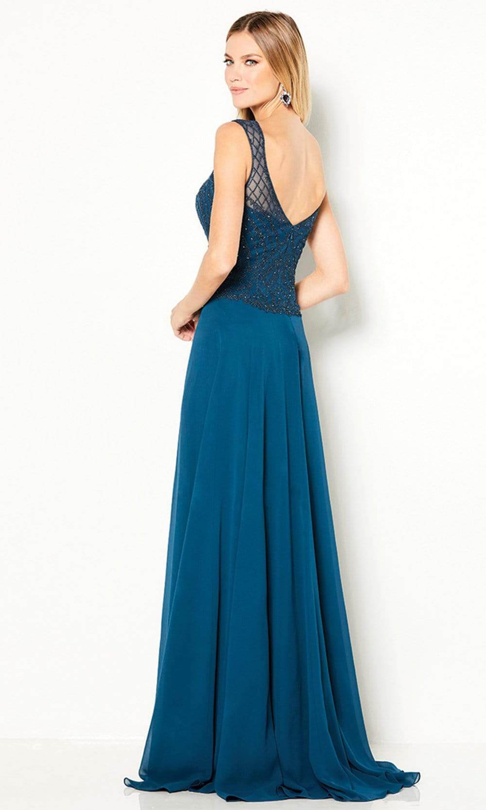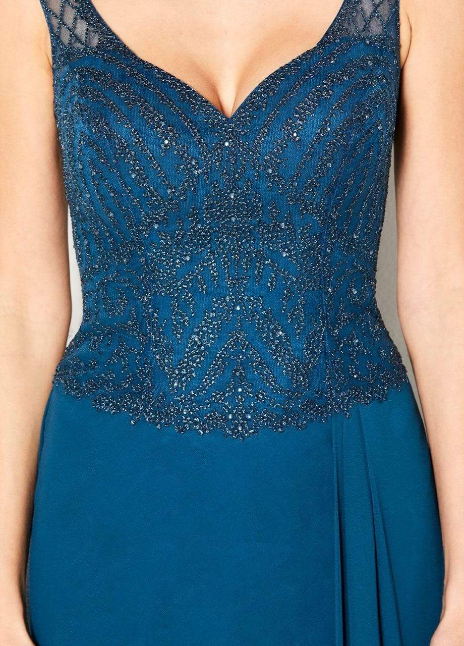 Parades in a sleeveless, V-neckline with straps. The bodice is ornate with bead embellishments and shows off a low V-back with a zipper closure. The skirt opens in a full length A-line silhouette with a sweep train finish. The dress includes a matching chiffon shawl. Model is wearing Dark Teal color.