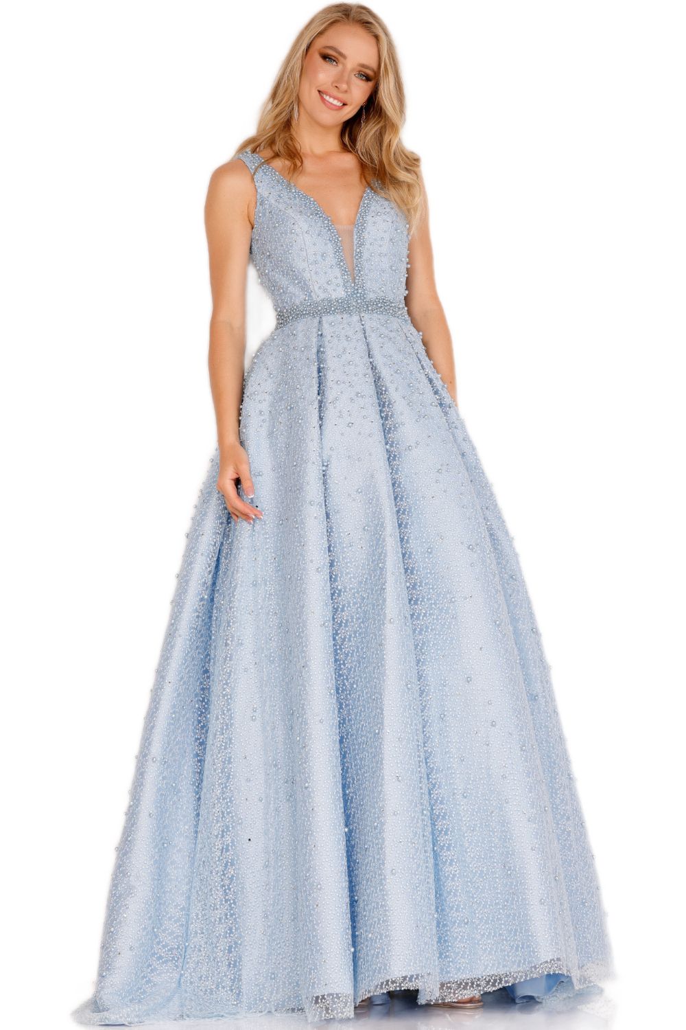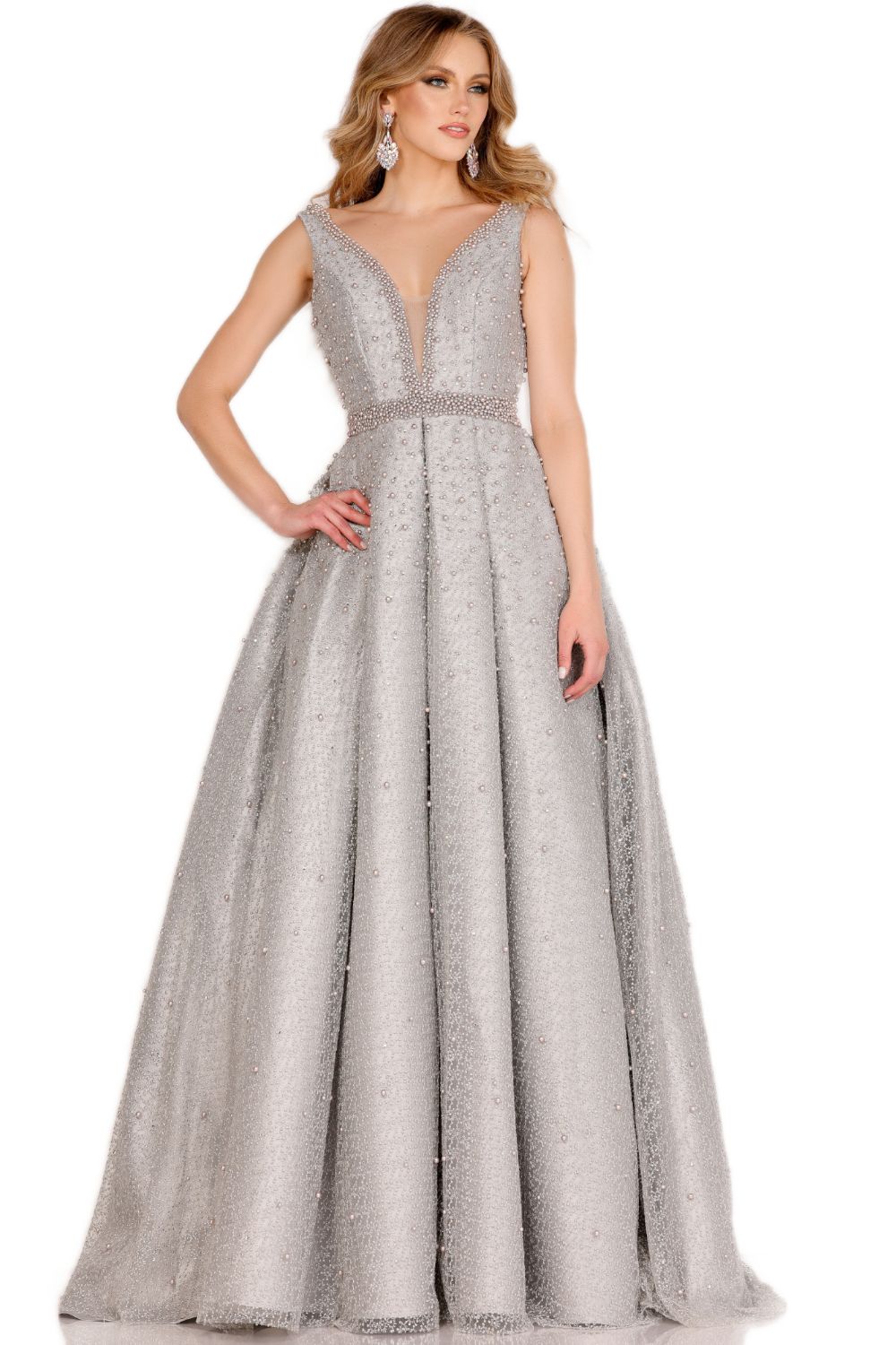 Appear like a modern princess in this luxurious gown from Cecilia Couture 1409. Elegant pearl beads lavishly ornate this full-length sleeveless gown. Features a princess seam fitted bodice that flaunts an illusion plunging V neckline with mesh inset support while the back reveals a low V cut shape. The skirt flares with pleating to a full A-line silhouette. This Cecilia Couture gown is an absolute breathtaking look!
