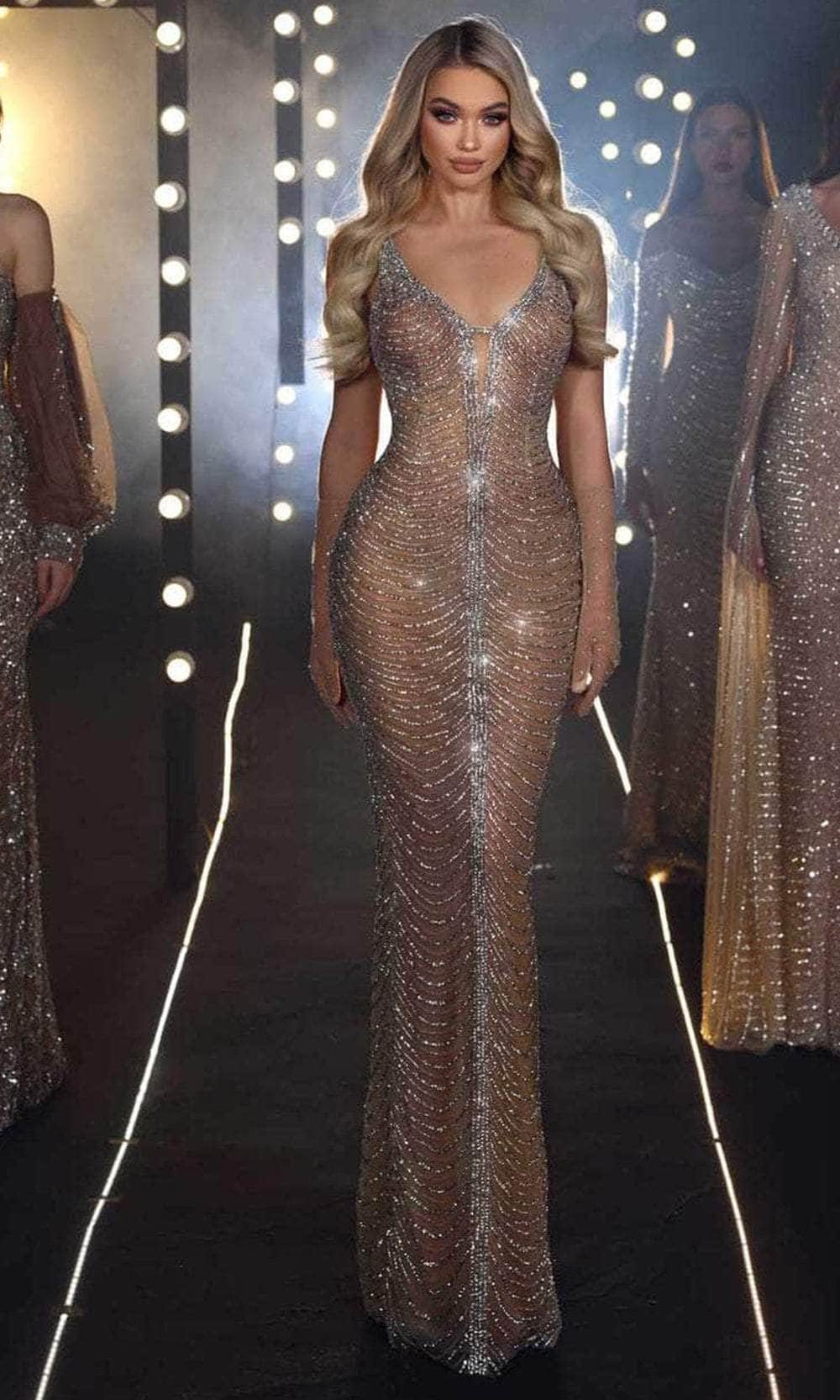 Bound to steal the spotlight in this winning creation by Chic and Holland AF330121. Wonderfully festooned with intricate beadings, this outfit embodies pure elegance and grace. The plunging v-neckline adds a touch of allure, and has wide shoulder straps for support. Designed in a sheath silhouette, the skirt flawlessly hugs your curves and skims to the full length hem. Fall in love when you slip on this Chic and Holland AF330121 prom dress. Model is wearing Nude color.