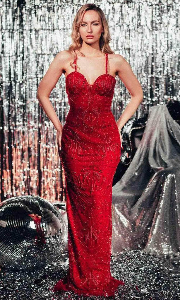 Impress everyone in this Chic and Holland AF330166, a breathtaking long evening dress boasting a captivating sweetheart neckline. Adorned with elegant sequin embellishments, this formal gown exudes glamour and sophistication. Shimmery spaghetti straps enhance the charm of the dress, showcasing a unique design intricately adorned with sequin work. The form-fitted silhouette gracefully extends into a floor-length column hemline, adding a touch of elegance to your ensemble. Dress up and look utterly breathtaking in this sparkling creation by Chic and Holland AF330166. Model is wearing Red color.