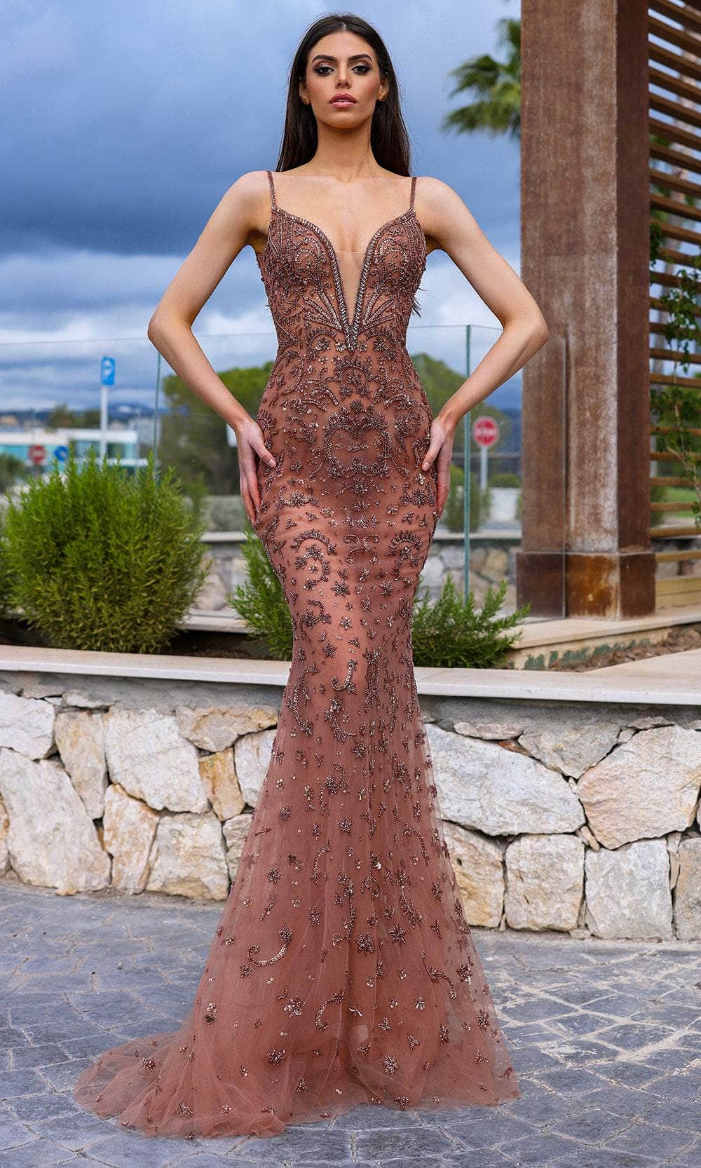 Embrace opulence in Chic and Holland AR330331, a masterpiece adorned with sparkling rhinestones throughout. The sleeveless fitted bodice boasts a daring plunging V-neckline adorned with a delicate sheer insert, enhancing its allure. The gown features a concealed center zipper closure at the scoop-shaped mid-open back for a seamless fit. Its floor-length skirt flows in a mesmerizing mermaid silhouette, culminating in a sweeping train, perfect for making a grand entrance at any formal affair. Chic and Holland AR330331 guaranteed to impress. Model is wearing Fawn color.