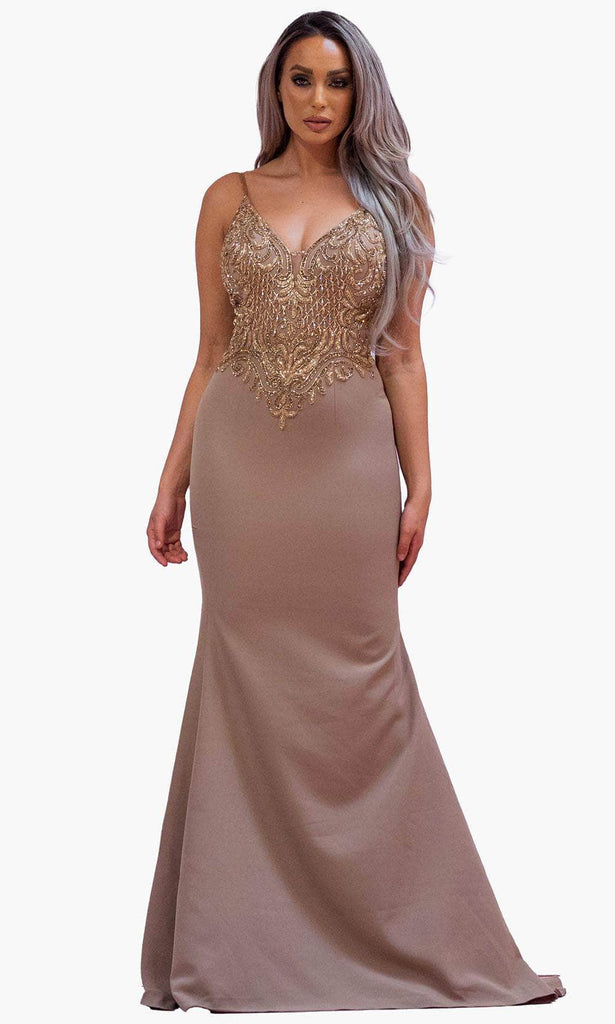 Feel divine in a heavenly creation from Chic and Holland BM1854. Featuring an intricate spectacle of beads on the sleeveless bodice framed with a deep V neckline and open back with spaghetti straps. The trumpet skirt flows down to a full-length hemline and sweeps train. This Chic and Holland evening dress will definitely make a statement in every occasion. Buy the trendiest and chicest Chic and Holland Haute Couture evening gowns, luxury evening dresses, chic Couture prom dresses, Haute Couture cocktail dresses and Haute Couture evening dresses to make a grand entry at special events. Model is wearing the Nude color.