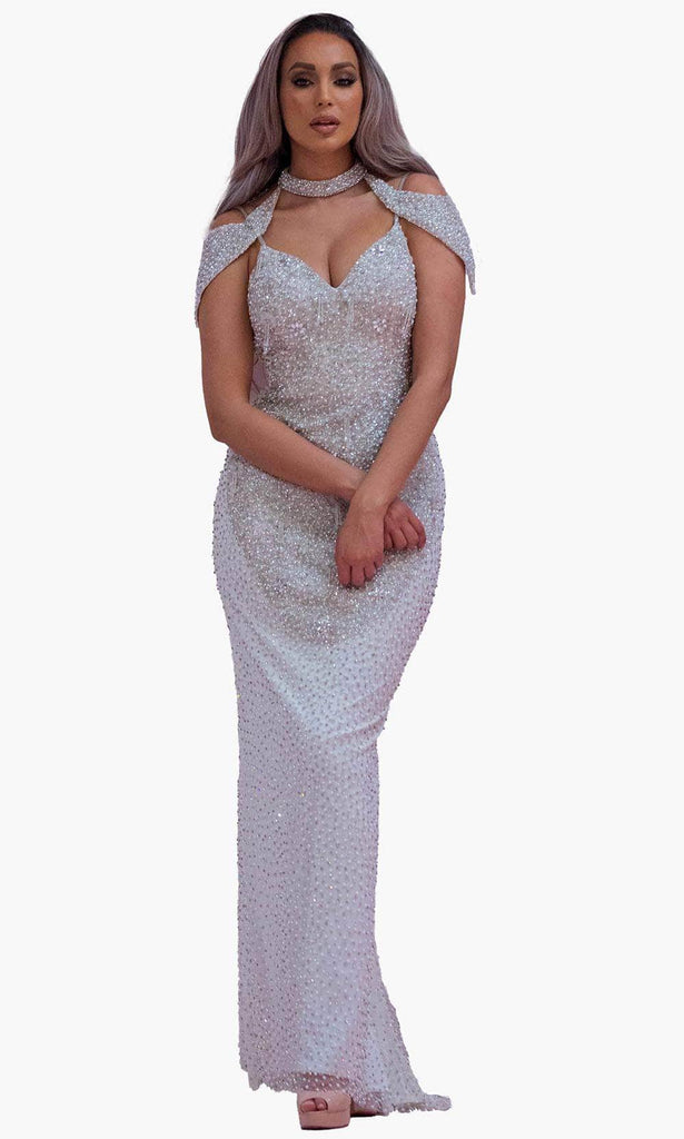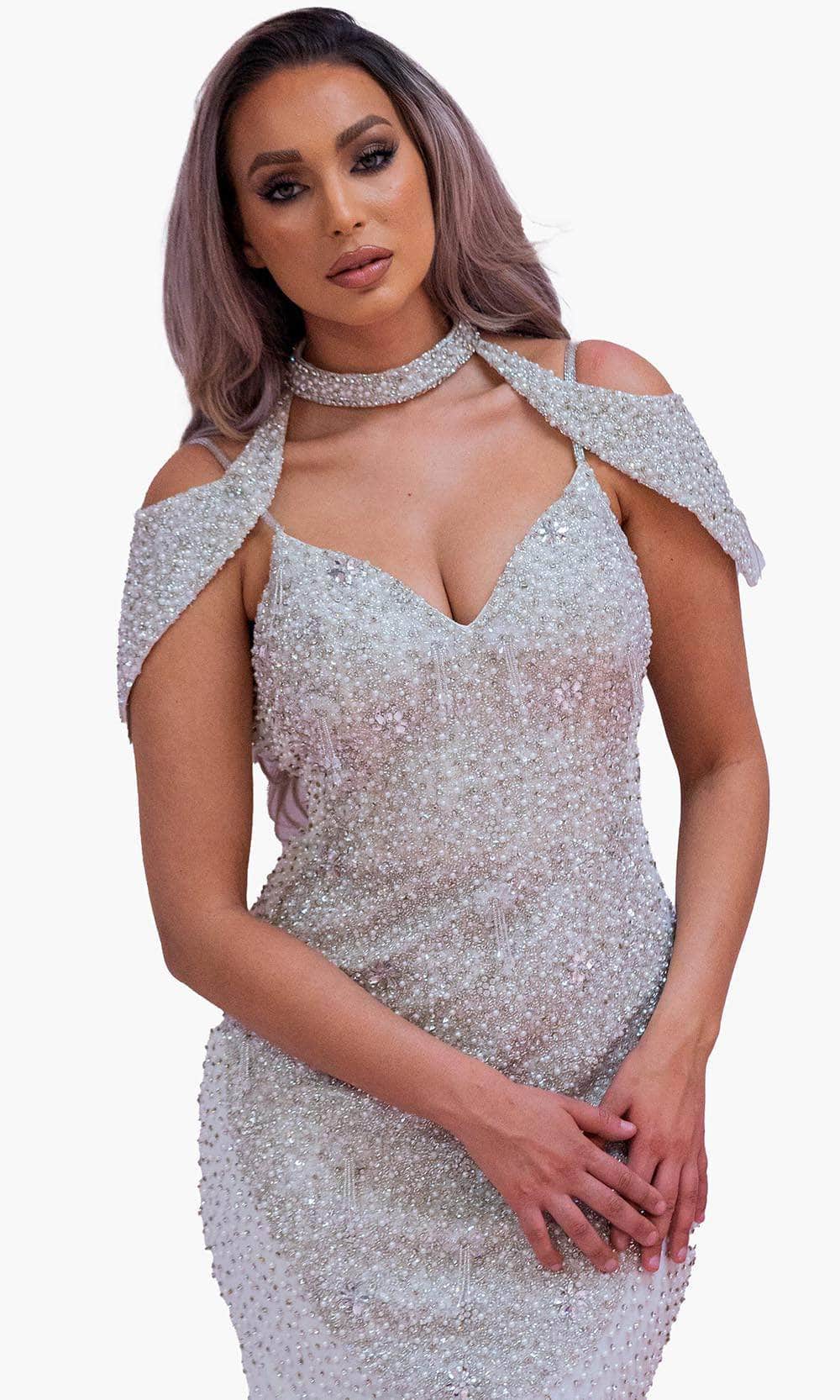 Look immaculately gorgeous in Chic and Holland BR1986 masterpiece. Lavishly ornate with beads throughout, this piece features a high neckline and short sleeves with a cold shoulder design. The fitted bodice highlights a wide V neck cut out and the back displays a low open cut enclosed with zipper closure. The skirt reveals a sheath silhouette with a full-length hemline. Embrace a style that is immaculately sultry as you glam up for your event in this Chic and Holland creation. Buy the trendiest and chicest Chic and Holland Haute Couture evening gowns, luxury evening dresses, chic Couture prom dresses, Haute Couture cocktail dresses and Haute Couture evening dresses to make a grand entry at special events. Model is wearing the White color.