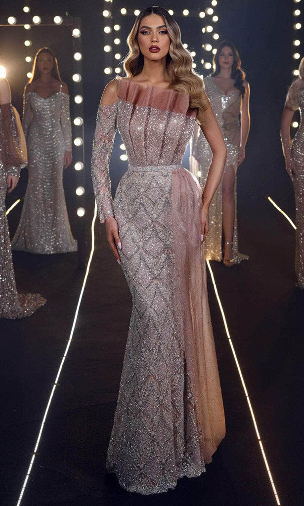 Make a grand entrance at the prestigious award event in the Chic and Holland HF110155 gown. Luxuriously crafted with allover studded strass and beadwork, this dress emanates opulence. The gown steals the spotlight with its asymmetrical pleated ruffled neckline, showcasing stellar glimmer. Rosy accents on the bodice and an off-shoulder long sleeve add a touch of romance to the design. The mermaid dress features a waistline accentuated by a shiny band and a sheer studded fabric along the side, creating an exquisite and dynamic silhouette that guarantees attention on the red carpet. Illuminate the night with the mesmerizing Chic and Holland HF110155 masterpiece. Model is wearing the Silver Mauve color.