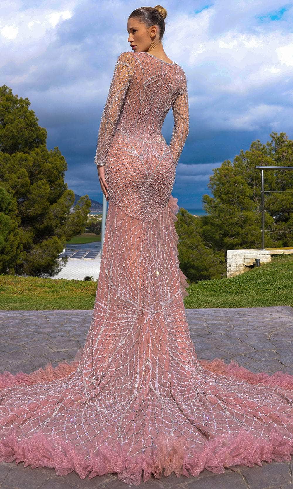 Details: Long Sleeve, Illusion Bodice, Beaded Lattice, Ruffle Trim, High Slit, Sweep Train, Full Back, Back Zipper