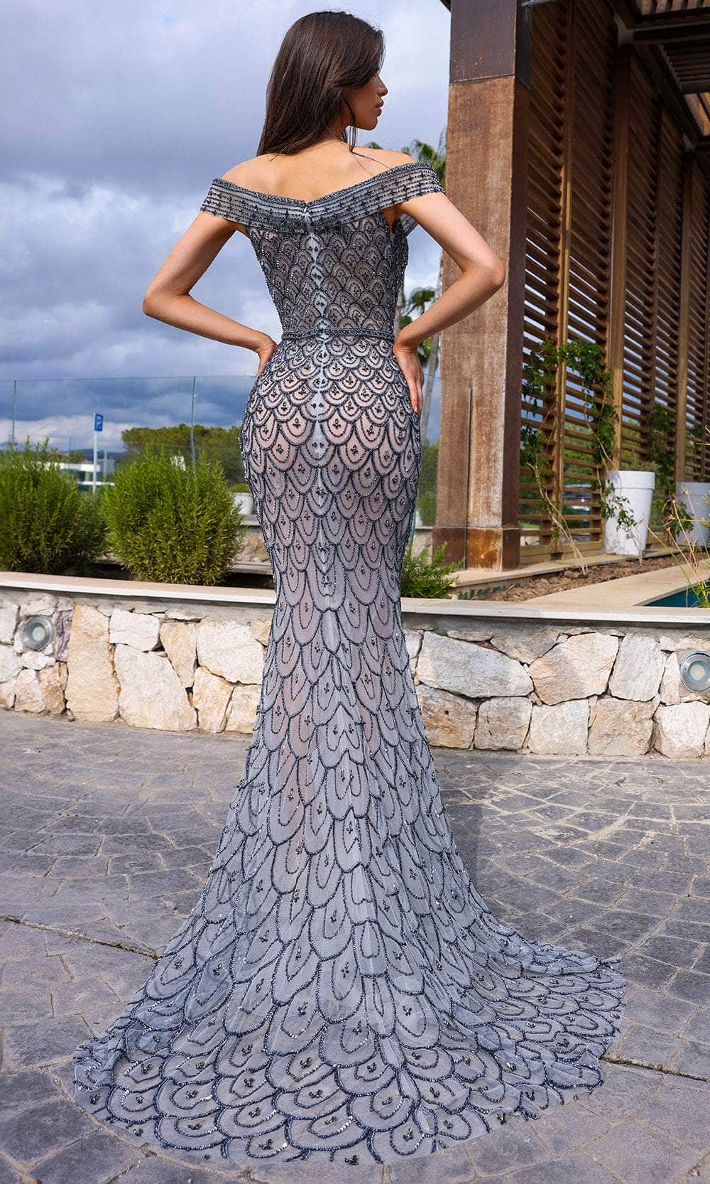 Embody red carpet charm in this remarkable Chic and Holland HF110411 dress. This ensemble has an illusion bodice that adds a feminine touch, and it is superbly encrusted in a beaded fish scale pattern that catches the light. The fold-over details on the off-shoulder v-neckline exude elegance, while the beaded thin belt accentuates your natural waist. The mid-open back cut is alluring, exposing a hint of your skin and having a center zipper closure. The sheath skirt skims your curves and falls to the dramatic flair of the sweeping train. This Chic and Holland HF110411 masterpiece guarantees a show-stopping entrance. Model is wearing Grey color.