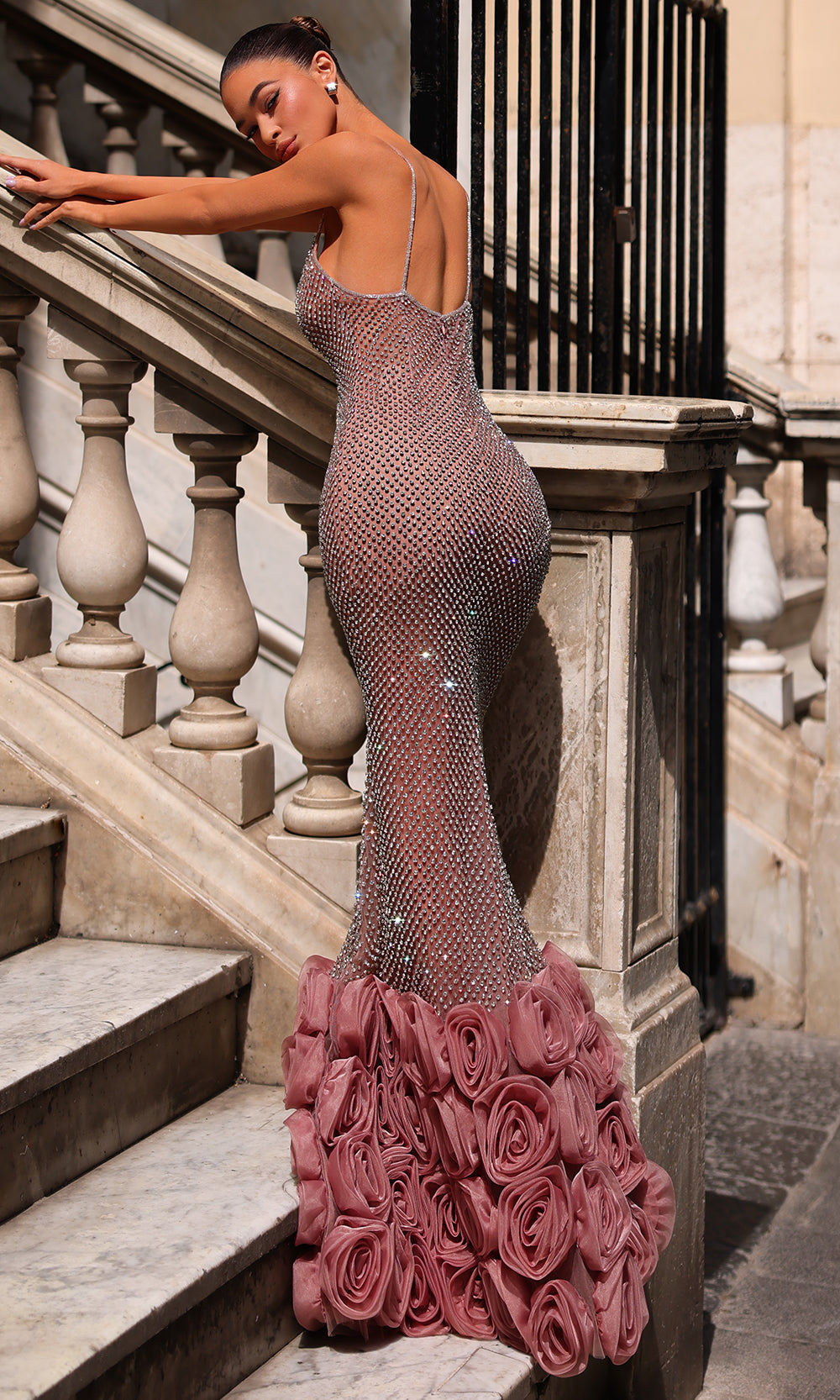 | Details: | 3D Floral Rosettes at Hem, Spaghetti Straps, Open Back, Concealed Zipper Closure, Handbeaded |
