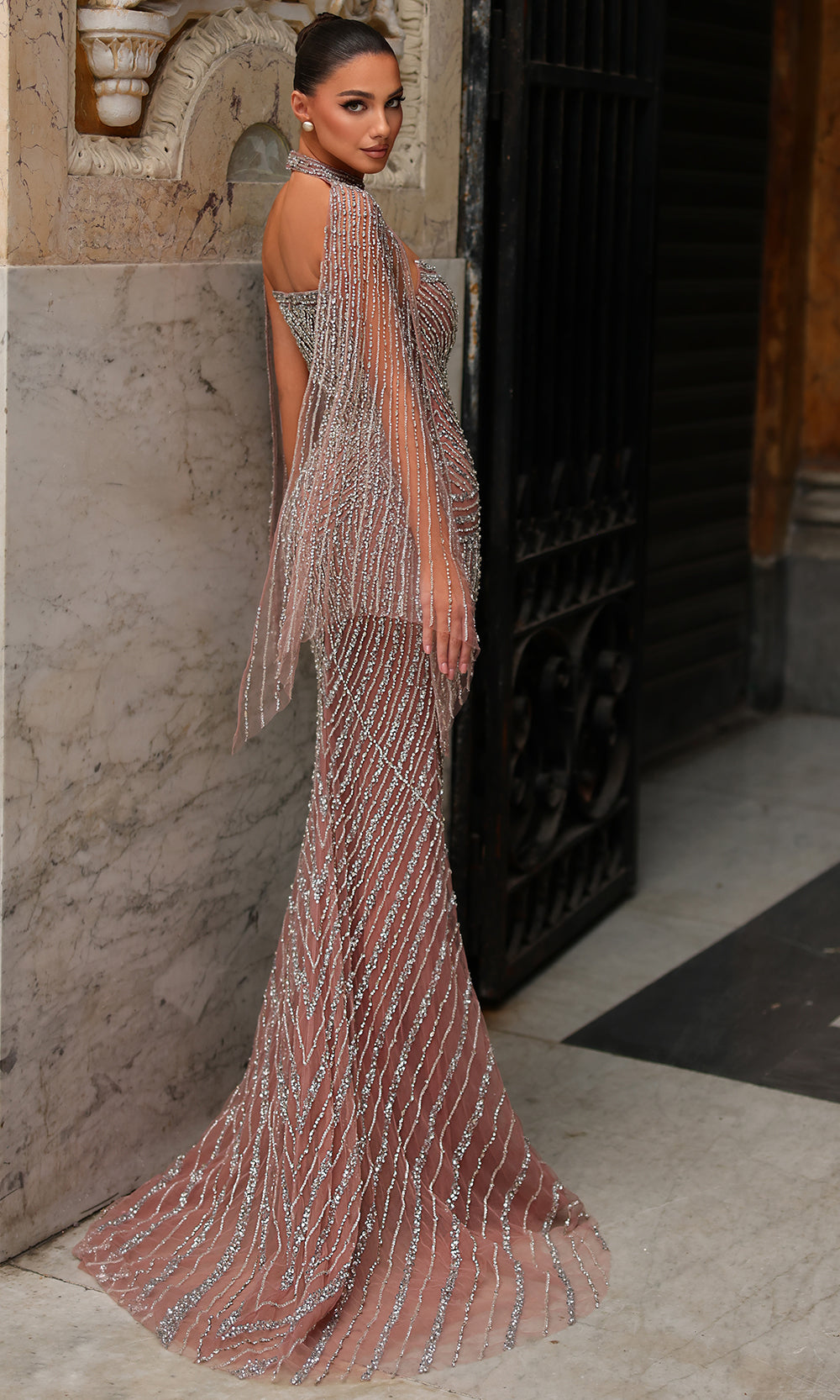 | Details: | Sheer Beaded Cape, Strapless, Midrise Back, Handbeaded |