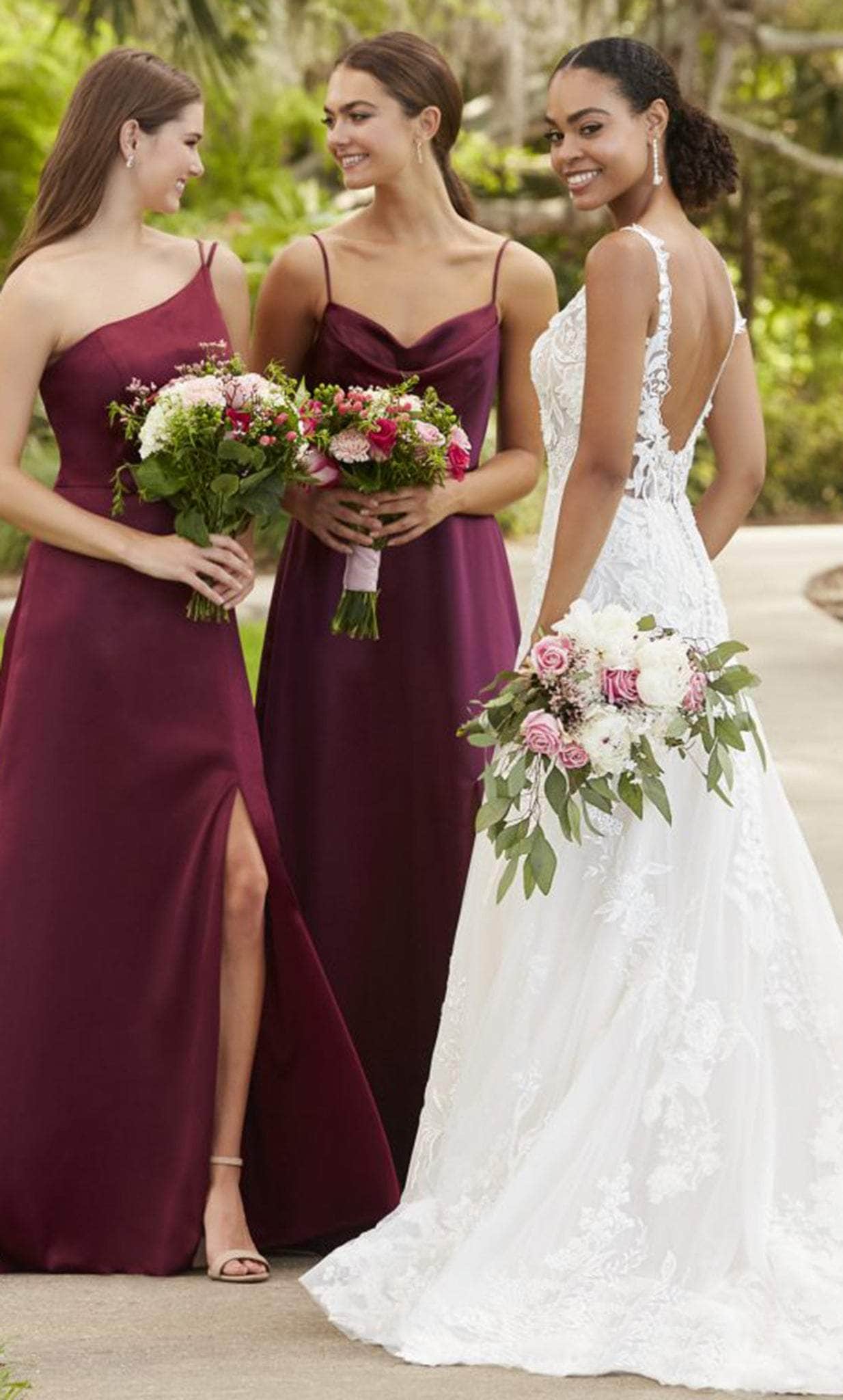 Class and sophistication are achieved in this sleek design dress by House of Wu 22154 creation. Sizzle all day wearing this stunning piece tailored in satin fabric and features a sleeveless asymmetric neckline with a one-shoulder strap for added flair. The A-line skirt has a front slit and ends in a full-length hemline. Embrace a radiantly romantic look in the flatteringly feminine dress from the House of Wu 22154 creation. Models are pictured wearing Mahogany, Navy, Perri, and Latte colors.
