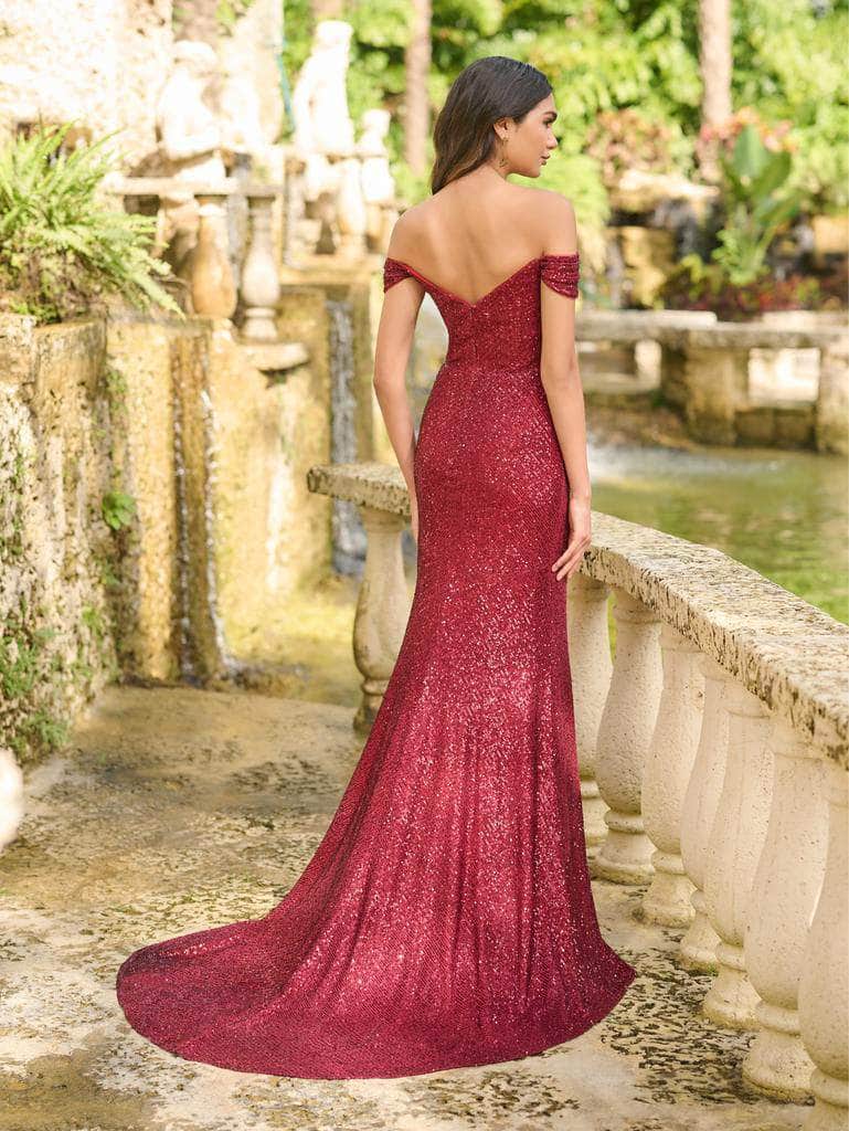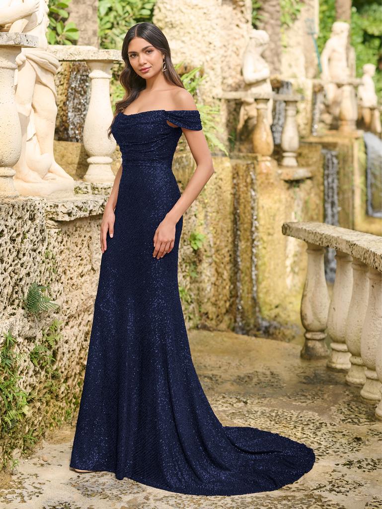 Make everyone jaw drop when you walk into the room in this Christina Wu Celebration 22217 masterpiece. This outfit is truly a showstopper with its all-over sequins that shine magnificently throughout the night. The off-shoulder neckline emphasizes your collarbones, while the cap sleeve and ruched detailing at the front bodice add a glamorous touch. The V-shaped cut at the back reveals just the right amount of skin and has a concealed zipper closure. A figure-hugging sheath skirt finishes the look and flows elegantly to the dramatic sweeping train. Let this Christina Wu Celebration 22217 take you to any party in elegance. Models are wearing Claret Shiny, and Navy shiny colors.
